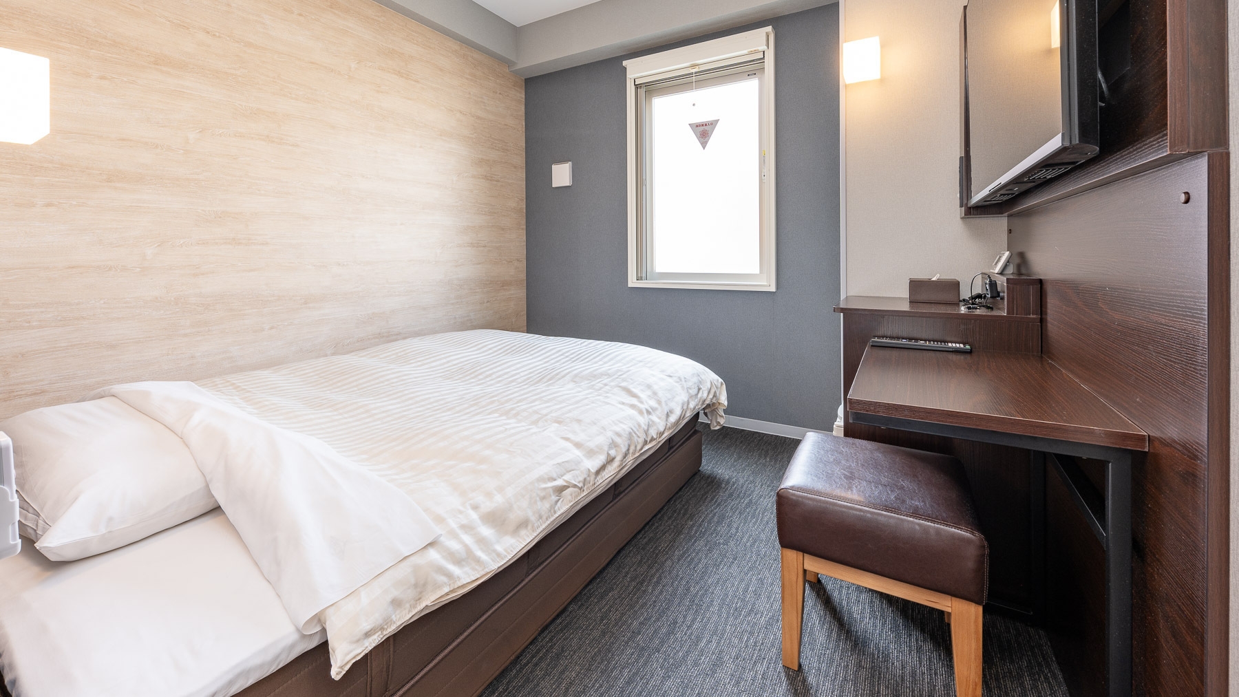 150cm幅のワイドベッド+広々デスクの【エクストラルーム】です。 広々デスクで仕事や作業がしやすいお部屋です。