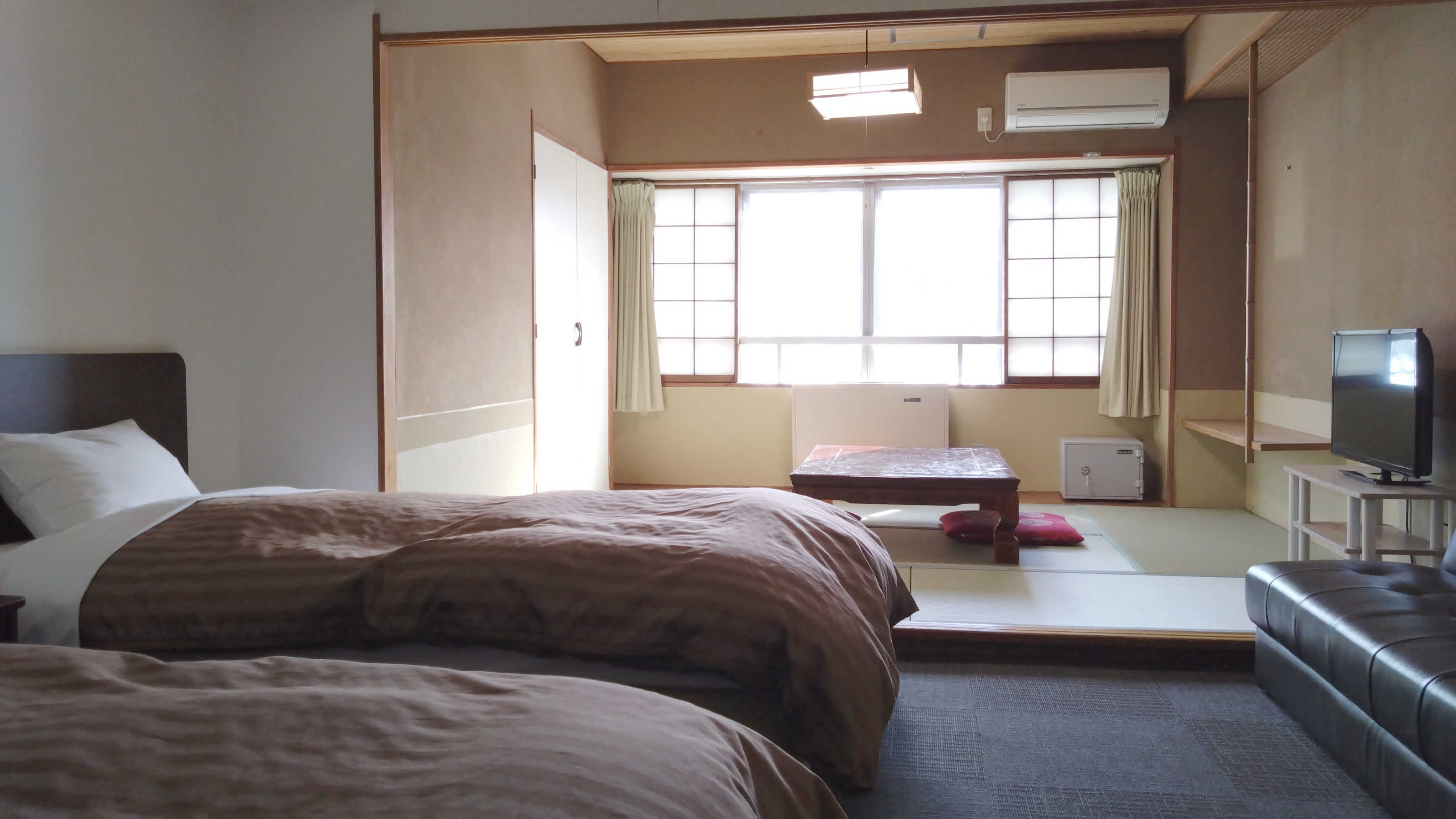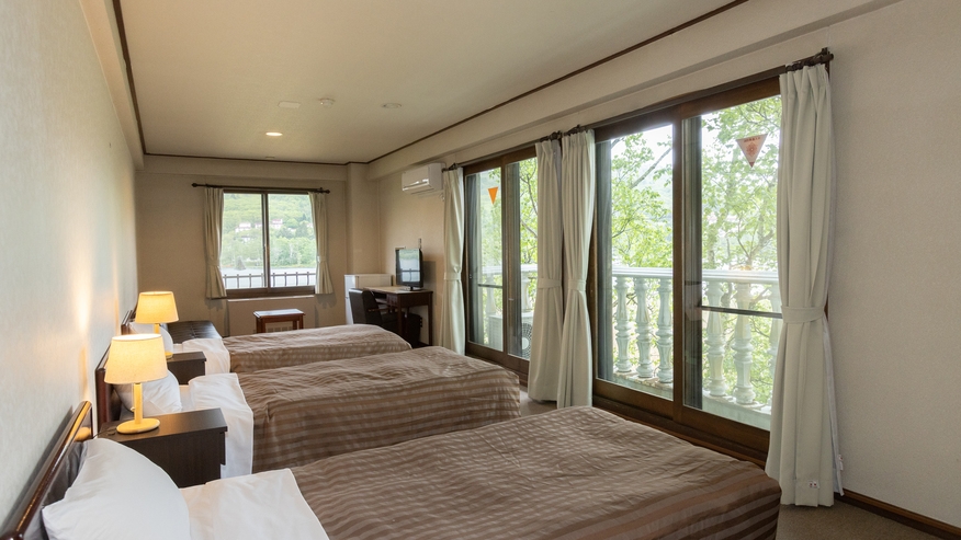 白樺湖を望むお部屋で、ベッド2台と6畳の和室があります。 和室スペースでお寛ぎいただけます。