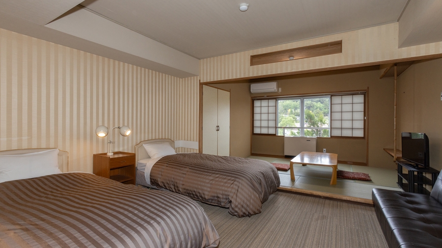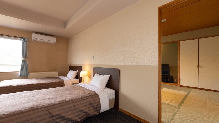 ベッド2台と6畳の和室があるお部屋です。 和室リビングでゆっくりお寛ぎできます。 ※眺望の指定はできません。