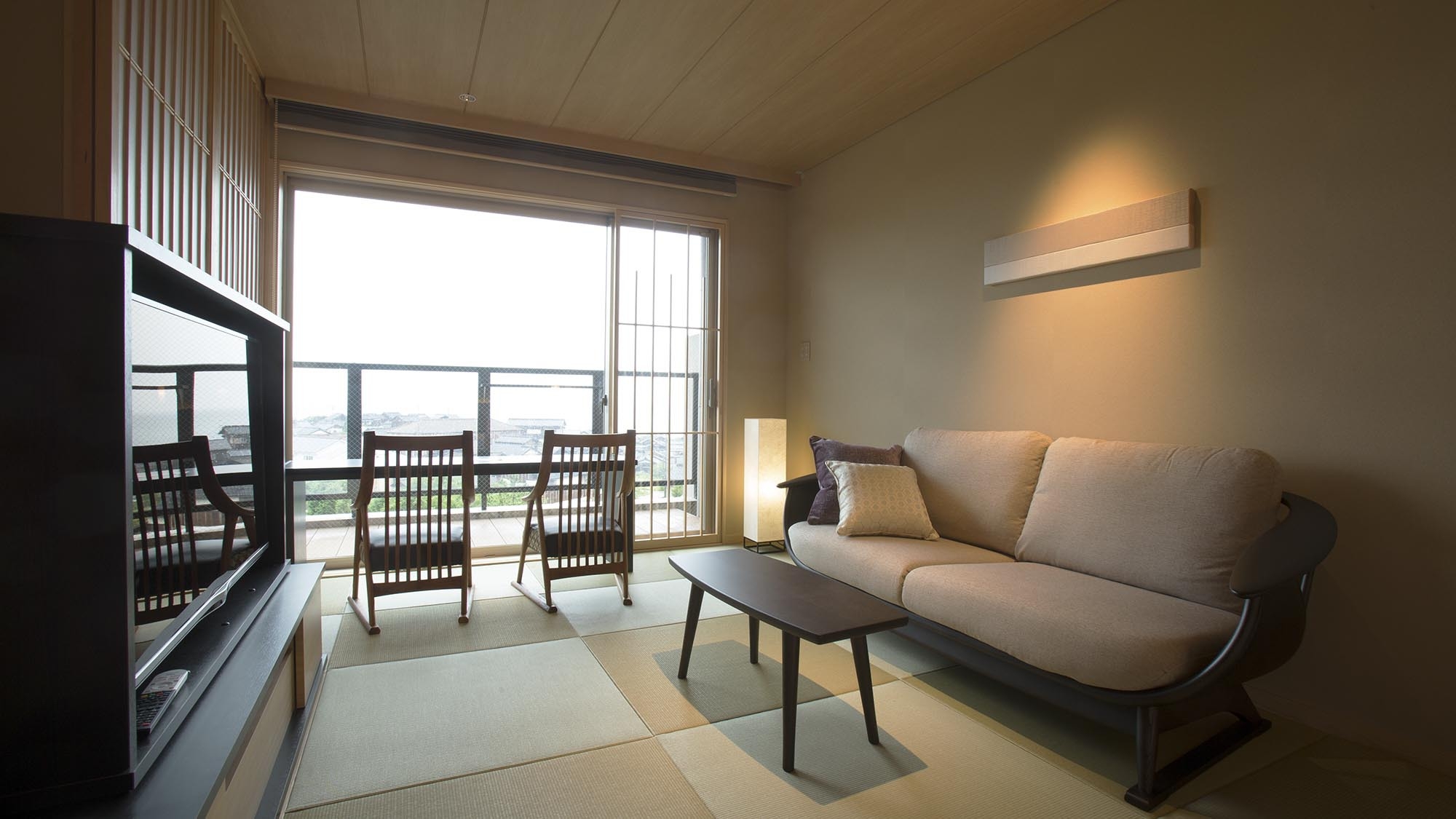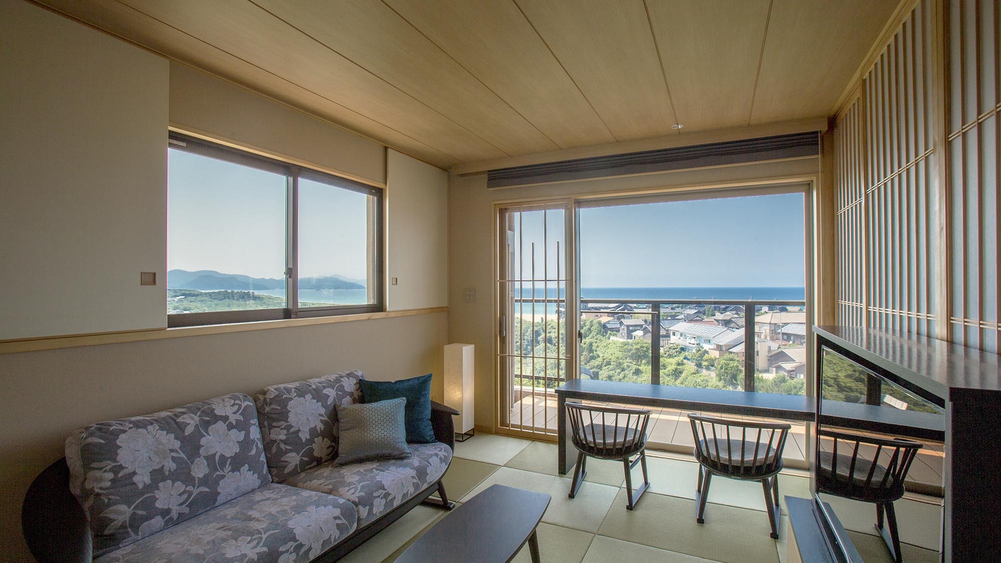 美しく眺望際立つモダン和室。140cm幅のツインベッド、リビングスペース&夕日カウンター、テラスに夕日バー ※禁煙