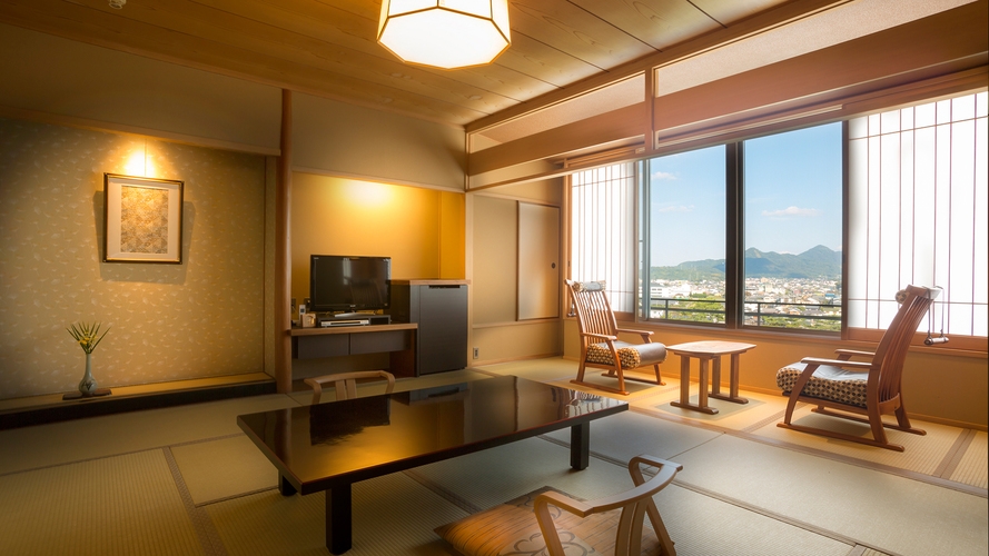 和室に加え和風ツインとリビングを備え、庭園や讃岐平野を一望できる贅沢なお部屋。※部屋食またはレストラン食(どちらかをご希望の場合は要事前連絡)※お風呂はバスタブ