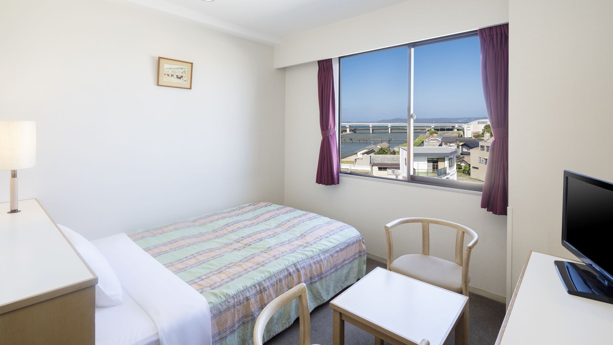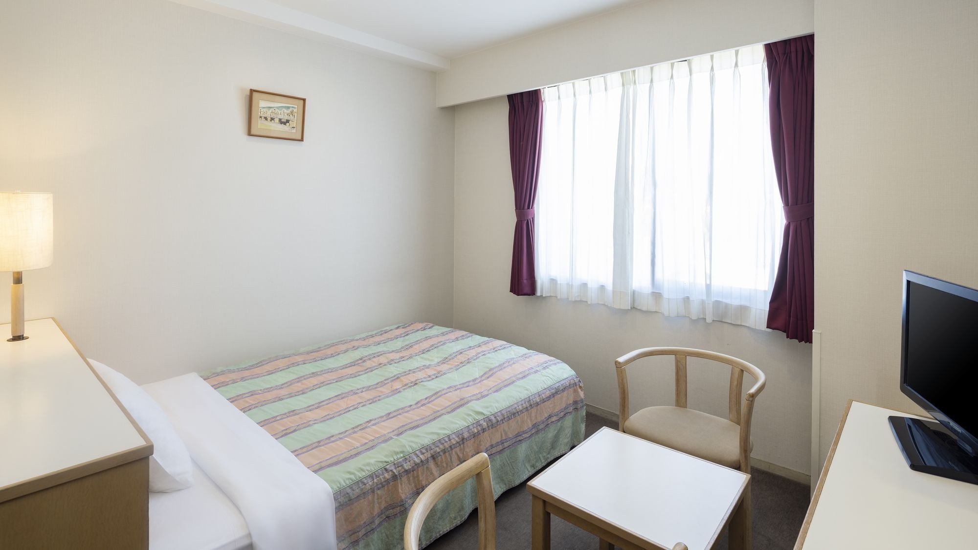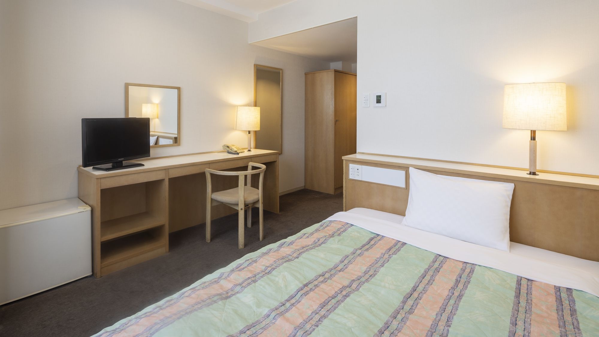 広さ:17平米/幅140cmのベッド1台を備えたお部屋です。全室Wi-Fi完備/VOD視聴無料/バス・トイレ完備