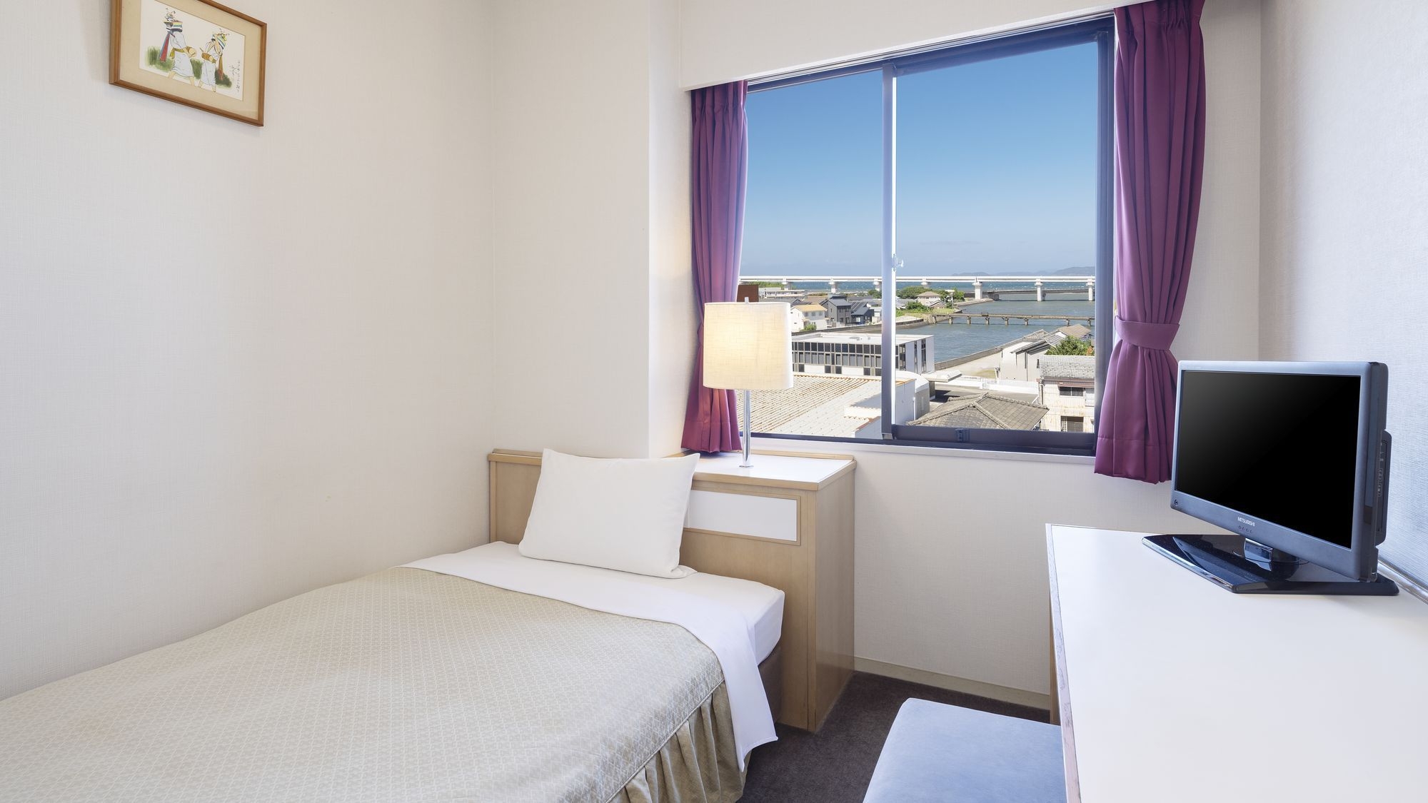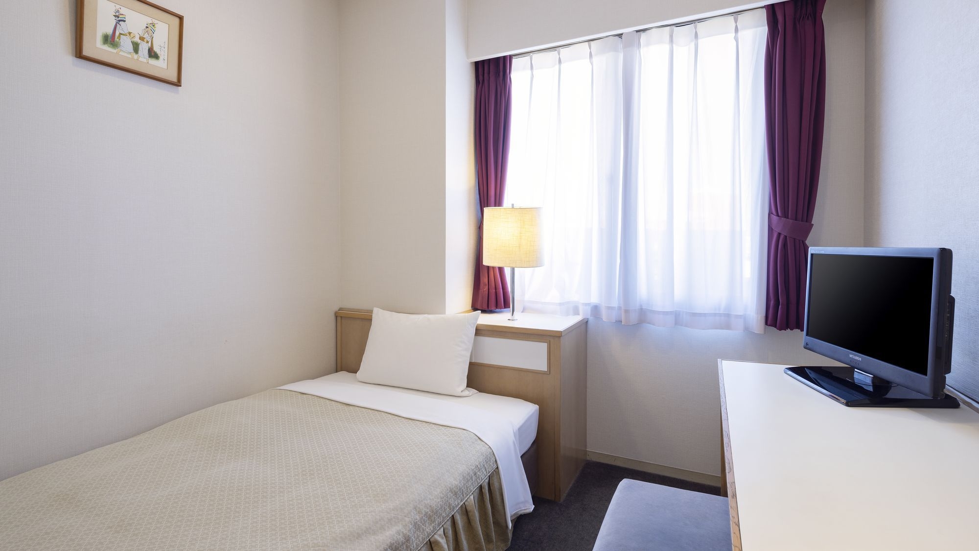 広さ:12平米/幅110cmのベッド1台を備えたお部屋です。全室Wi-Fi完備/VOD視聴無料/バス・トイレ完備