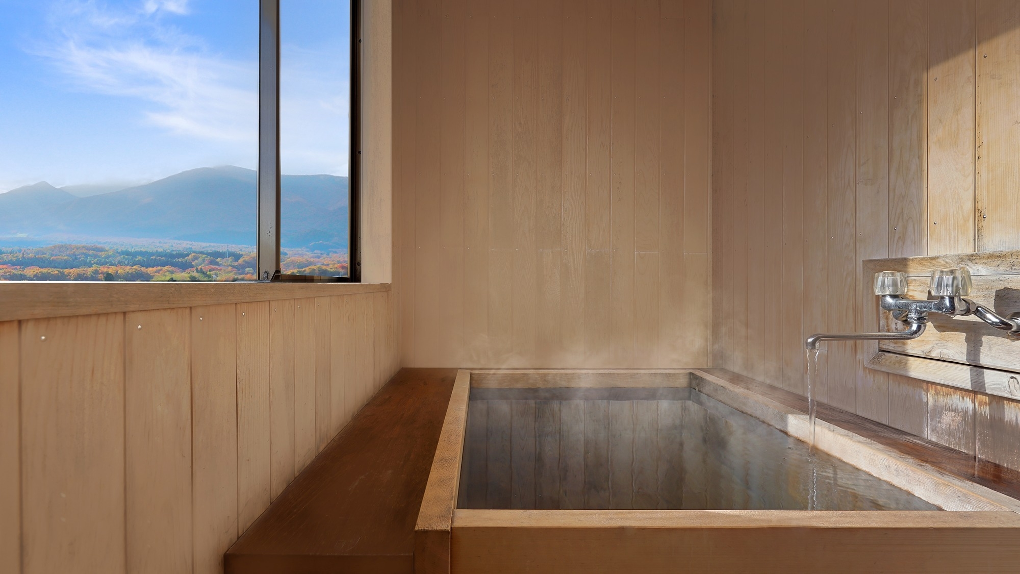 全室が禁煙で、蔵王連峰が見える10〜12.5畳のお部屋をご用意しています。桧風呂は一部のお部屋にございます(指定不可)。全室にバスルームを完備。