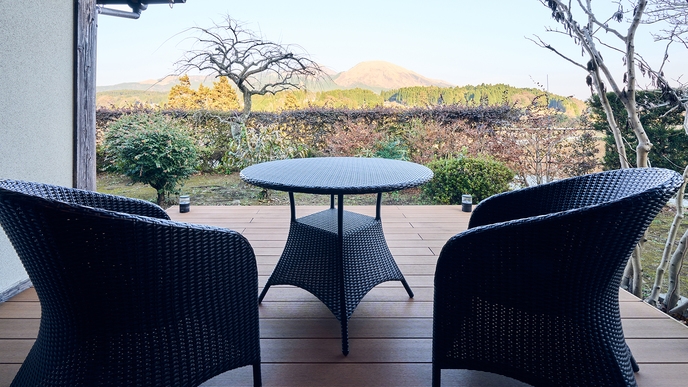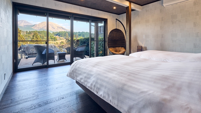 2024年12月リニューアル。阿蘇五岳を望むテラス。半露天風呂は窓を解放して入浴すると露天風呂のよう! セミダブル2台(シモンズベット)※3名様以上は簡易ベッド