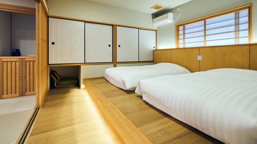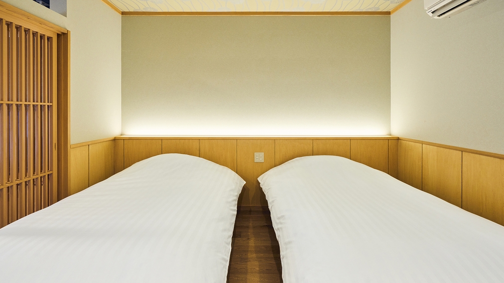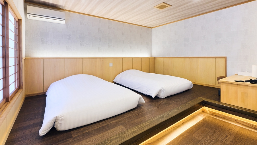 2024年12月リニューアル。ユニバーサルデザイン客室。広々とした洋室にはセミダブル2台(シモンズベット)3名様以上でご利用の際は簡易ベッドをご用意します。