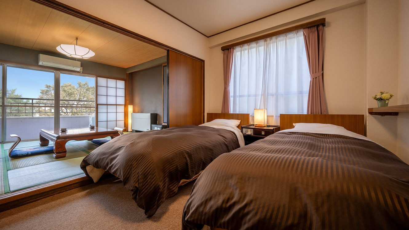 広々とした畳の空間に、休息にこだわったベッドを配置。 川のせせらぎを聞きながらベッドでうたた寝するもよし。 心安らぐお時間をお過ごしくださいませ。