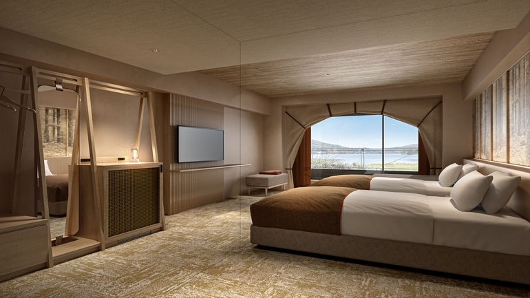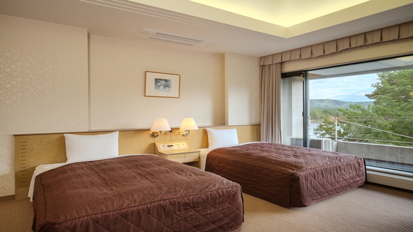 90平米を誇るゆとりある空間で窓からは当ホテル自慢の女神湖を望むことが出来ます。 シングルベッド2台とソファベッド2台、布団4枚で8名様までご利用いただけます。