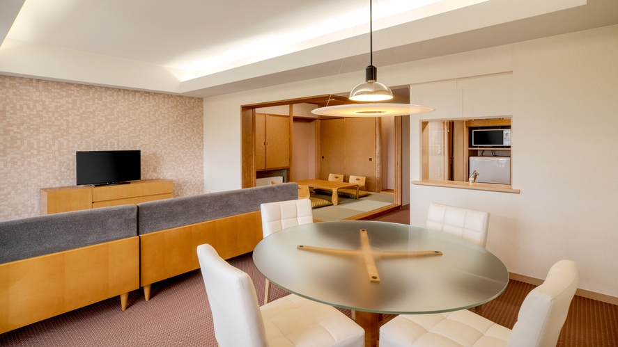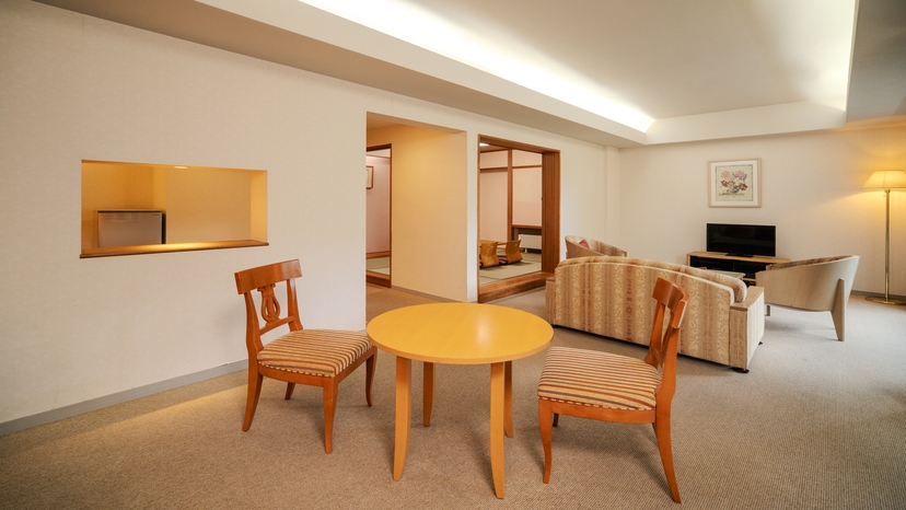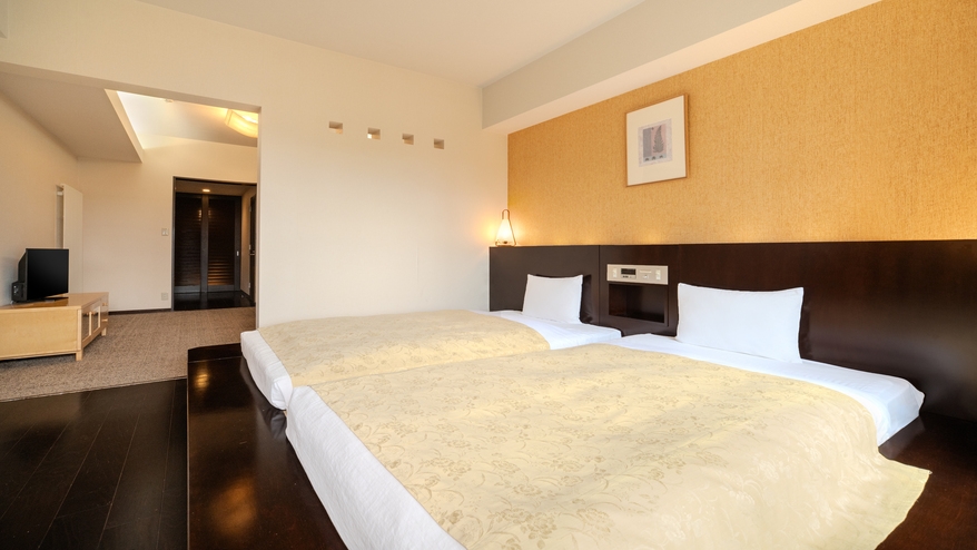 84平米という広々とした客室で落ち着いた雰囲気の和洋室。 シングルベッド2台とソファベッド1台、布団3枚で6名様までご利用いただけます。