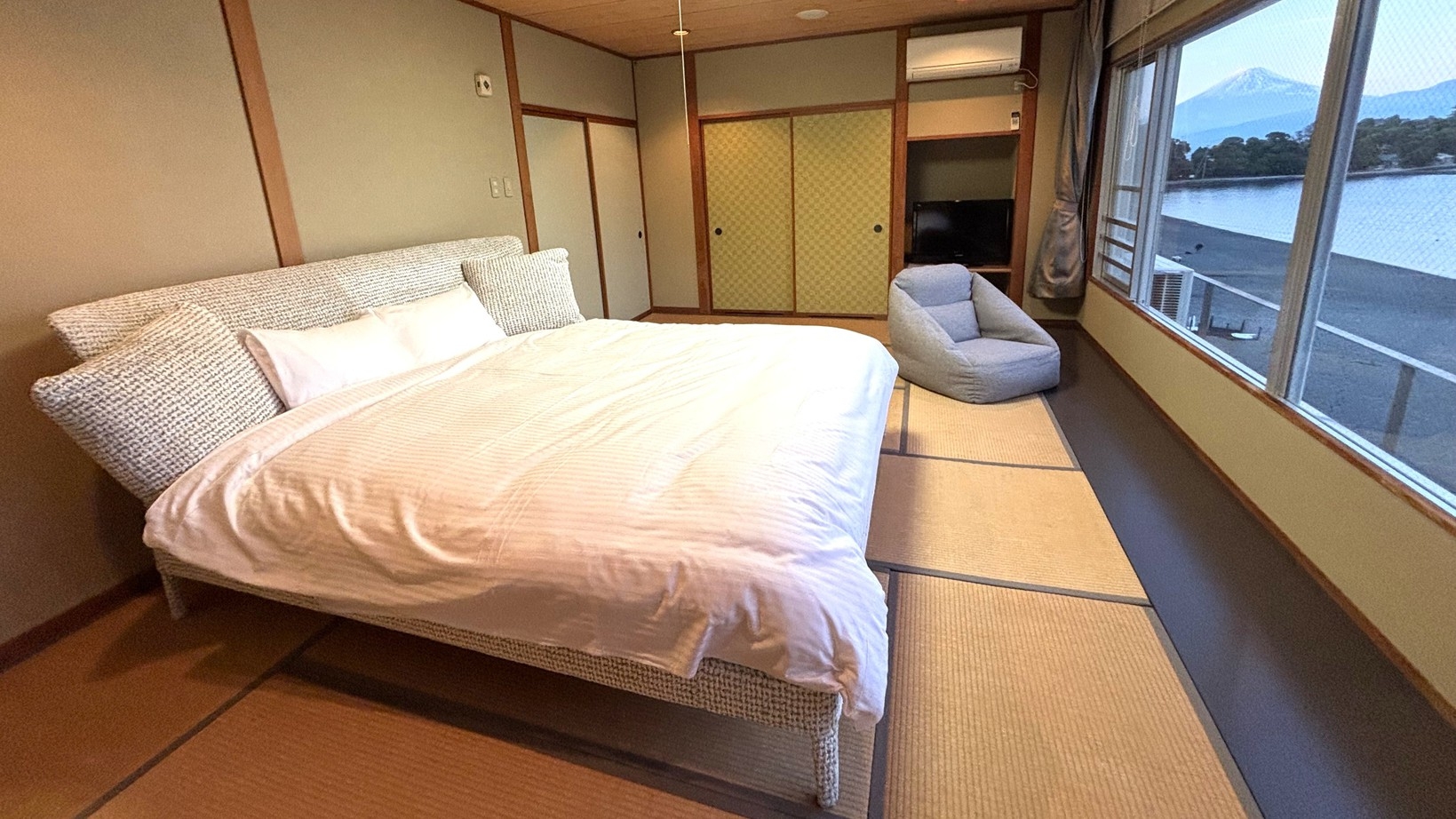 【禁煙】和室15帖 ◆客室設備:ダブルベッド1台・トイレ ・テレビ ・無料wi-fi ・冷蔵庫 ・バルコニー ※海辺棟越しの駿河湾眺望 ※バス無し