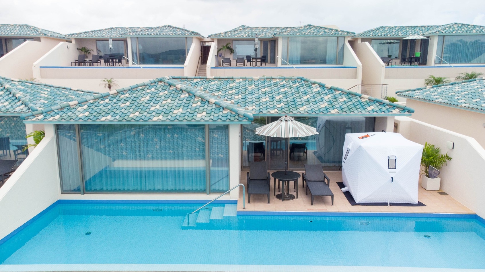 冬季限定の特別室 エグゼクティブスイートのプライベートプールにテントサウナを設置
