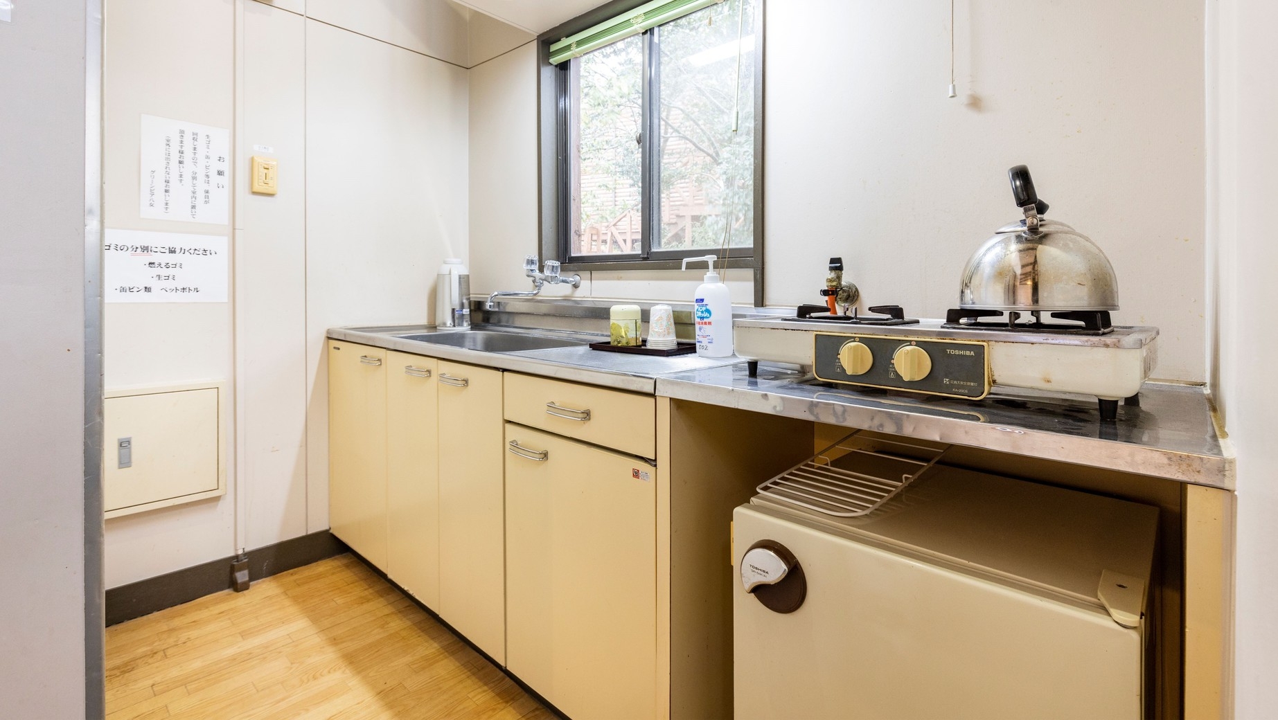 テレビ、エアコン(冷暖房)、トイレ、キッチン(やかん、ポット、紙コップ)、ガスコンロ、冷蔵庫、寝具、歯ブラシ、タオル付(浴衣、バスタオルは付いておりません。)