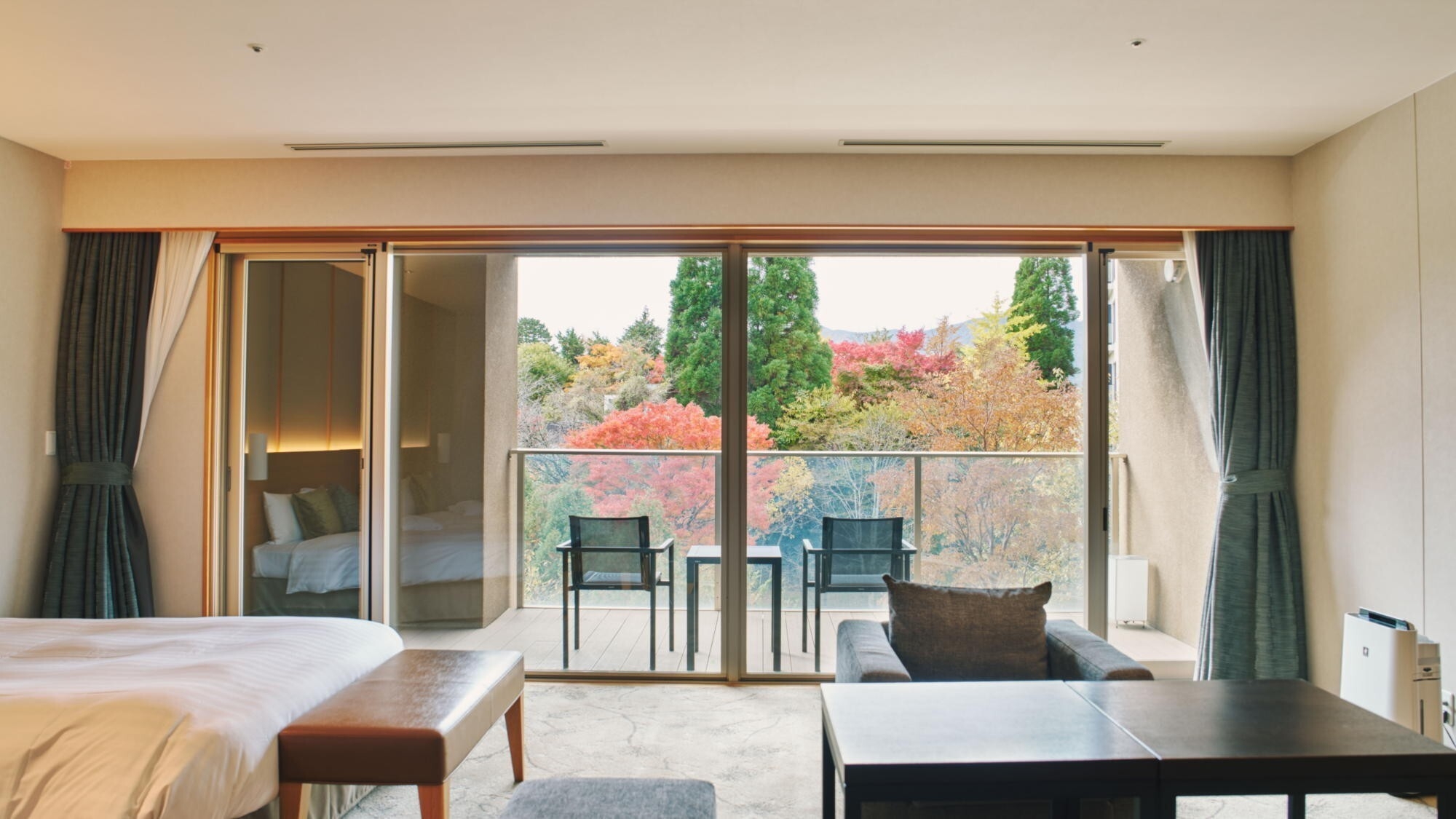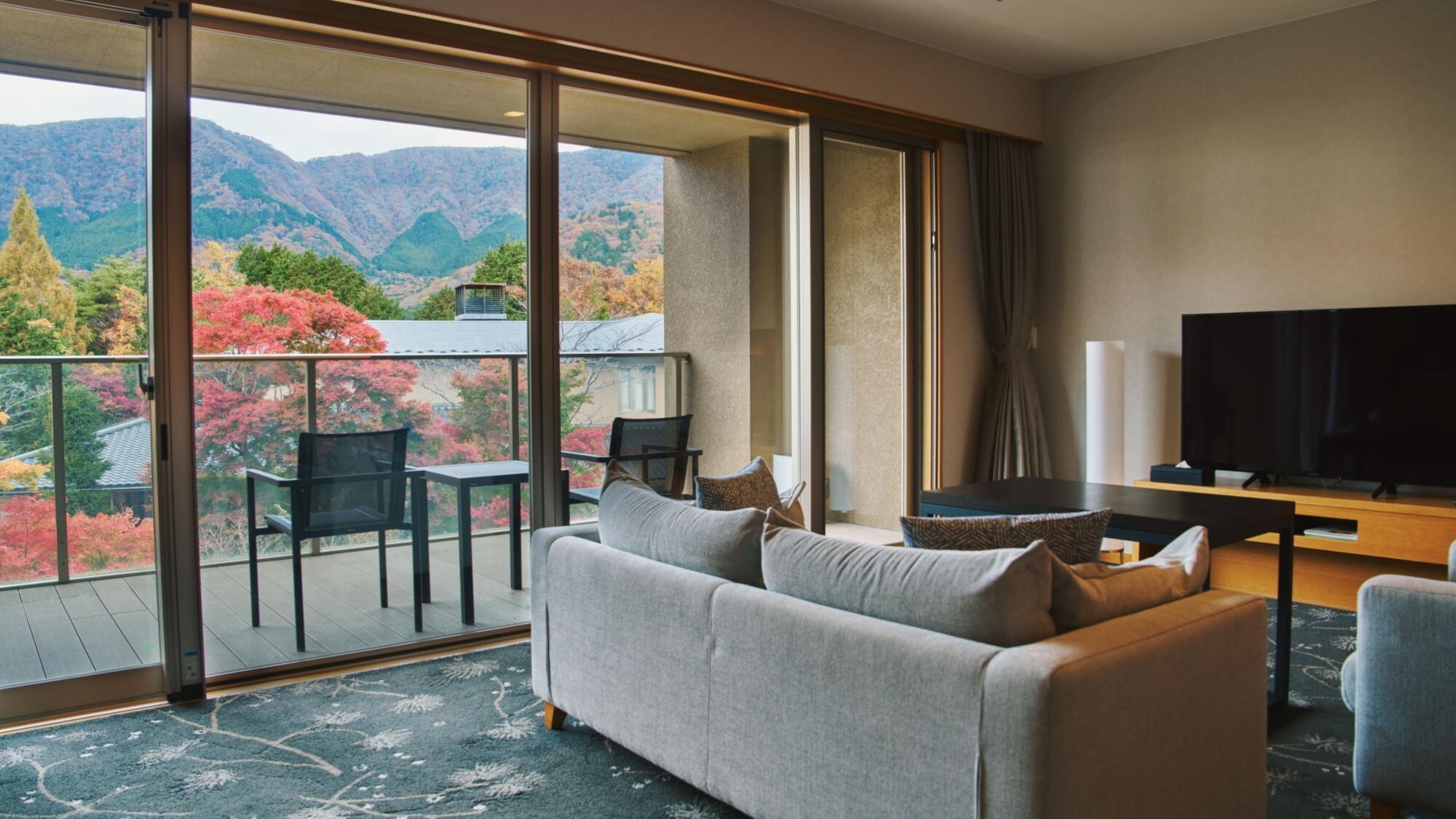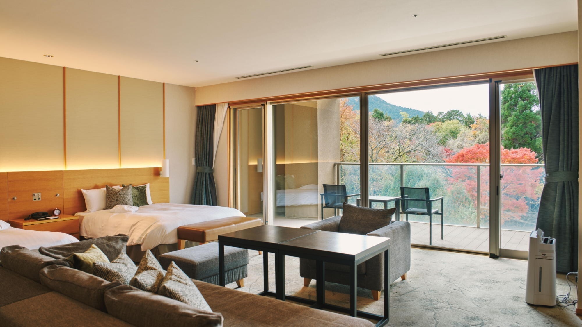 デイベッドを設けた広々とした64平米。テラスに出ると箱根の澄んだ風で優雅な空間に包まれます。客室内温泉内風呂は新姥子温泉。客室内冷蔵庫のドリンクは無料。