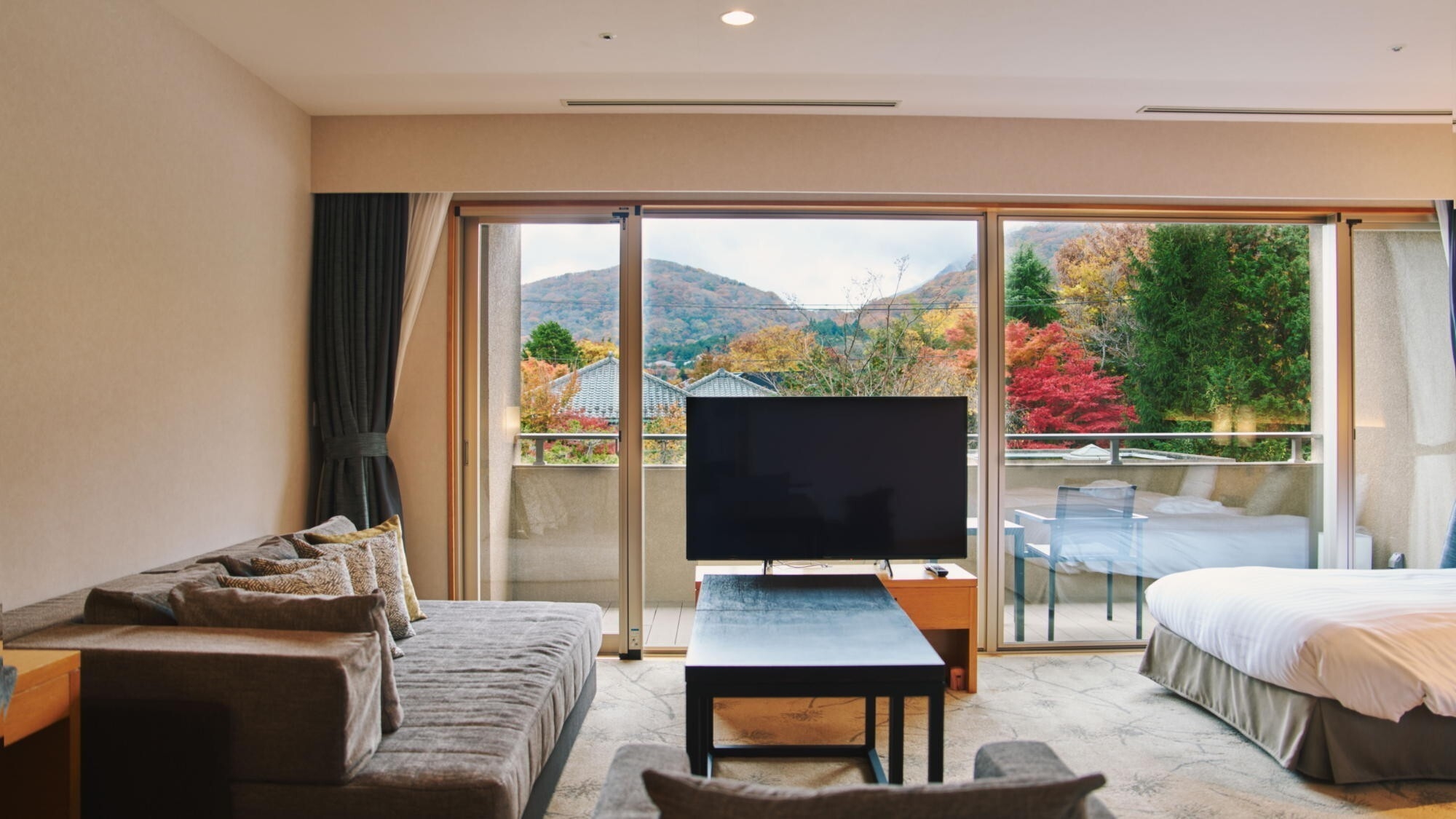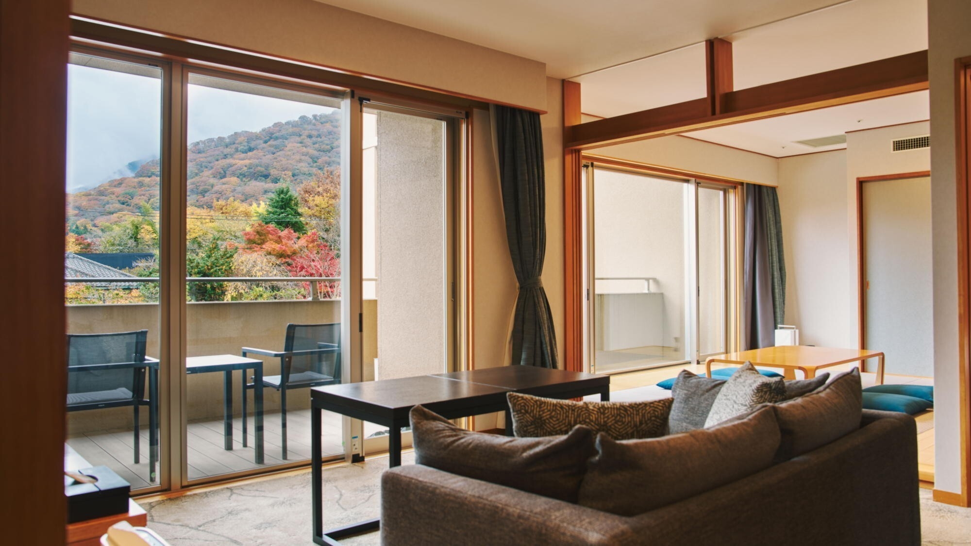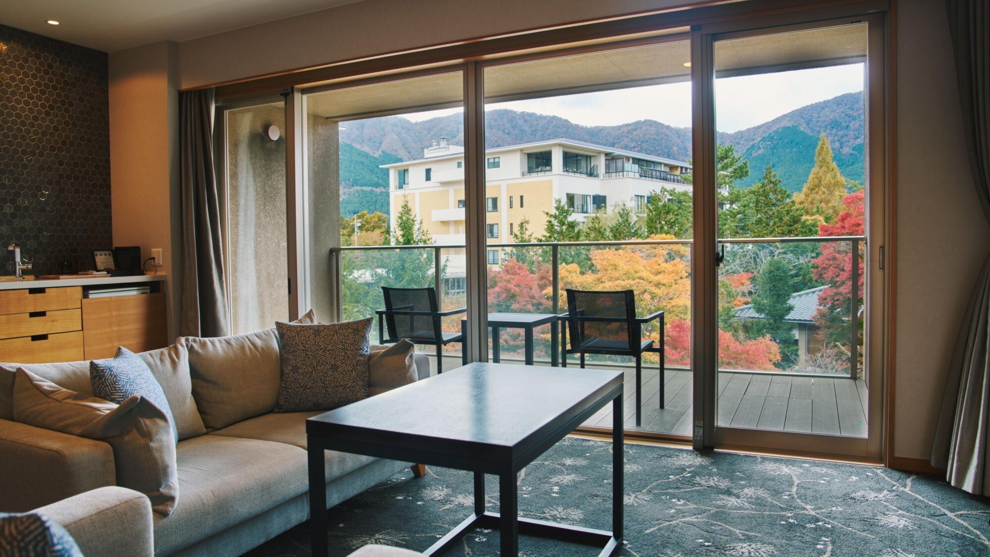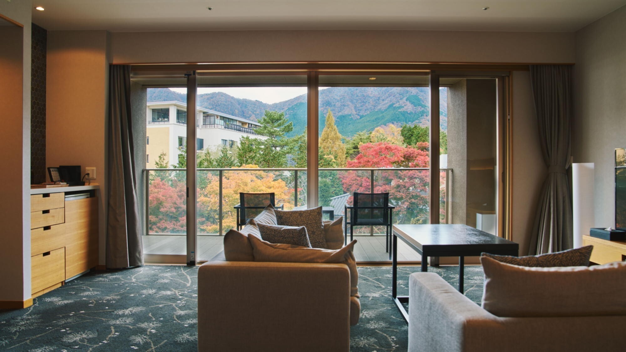デイベッドを設けた広々とした64平米。テラスに出ると箱根の澄んだ風で優雅な空間に包まれます。客室内温泉内風呂は新姥子温泉。客室内冷蔵庫のドリンクは無料。