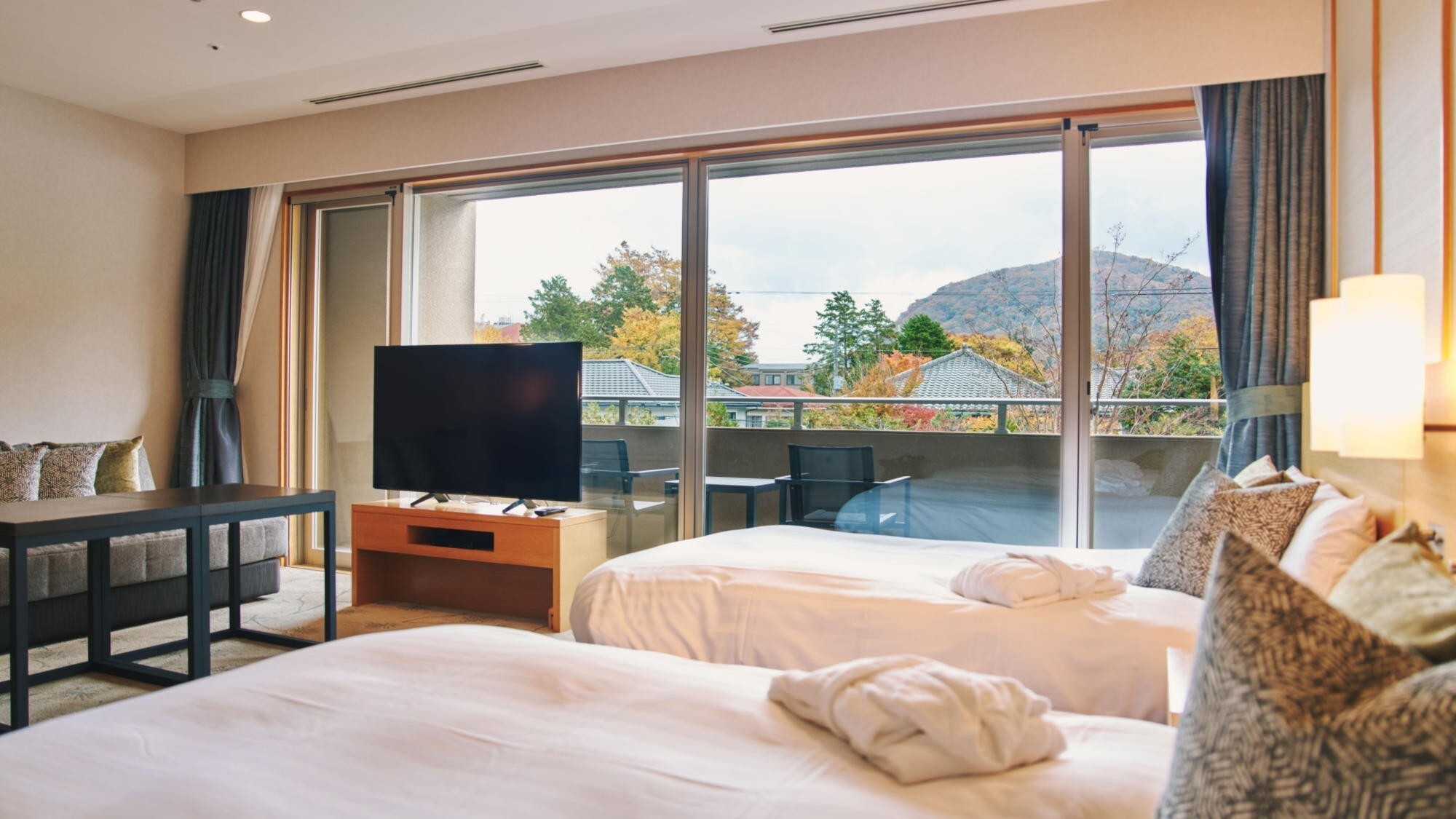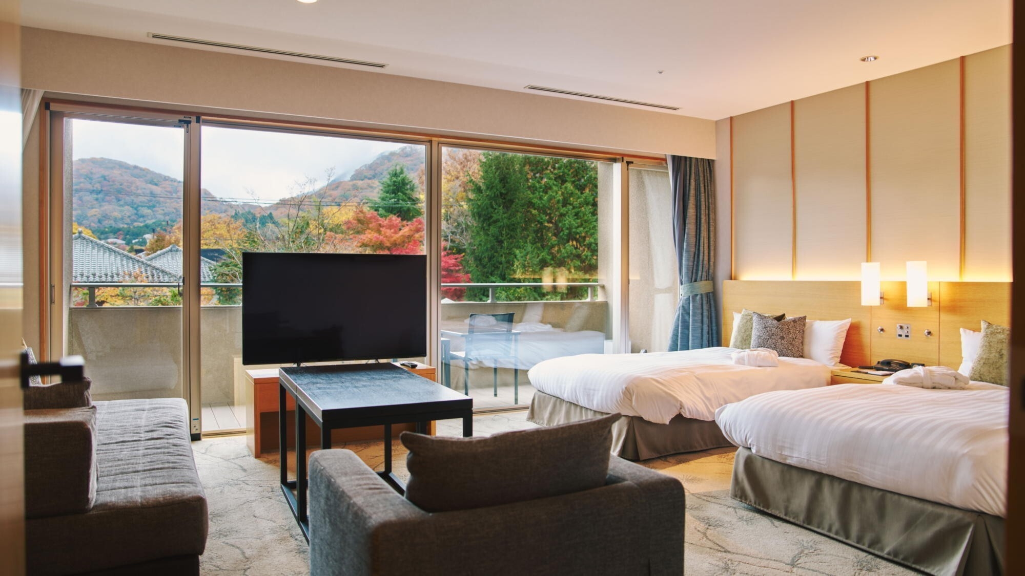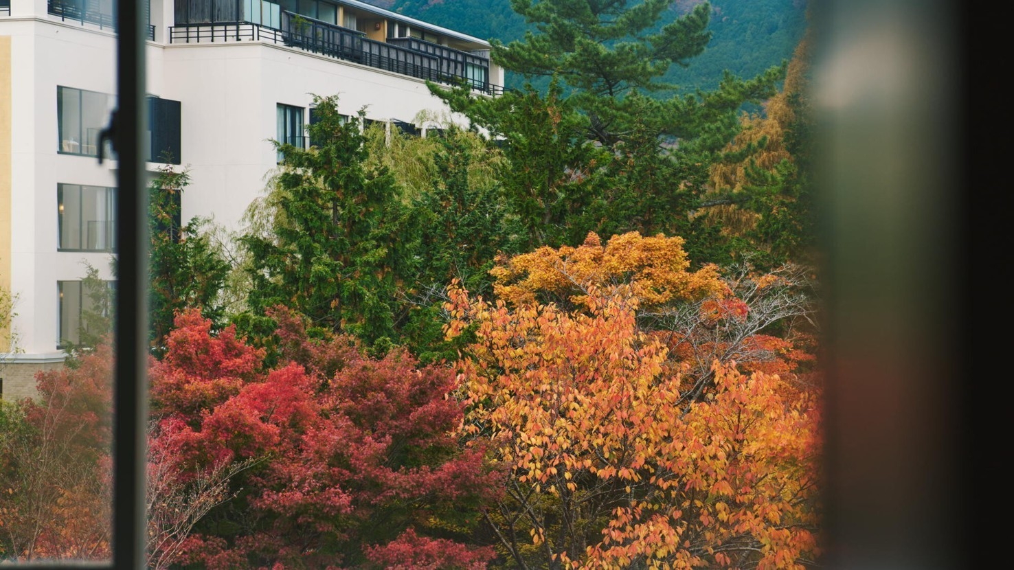 美しい四季の移ろいを映した庭園の中心に面し、四季の景色をお楽しみいただけます。客室内温泉内風呂は新姥子温泉。客室内冷蔵庫のドリンクは無料でお楽しみいただけます。