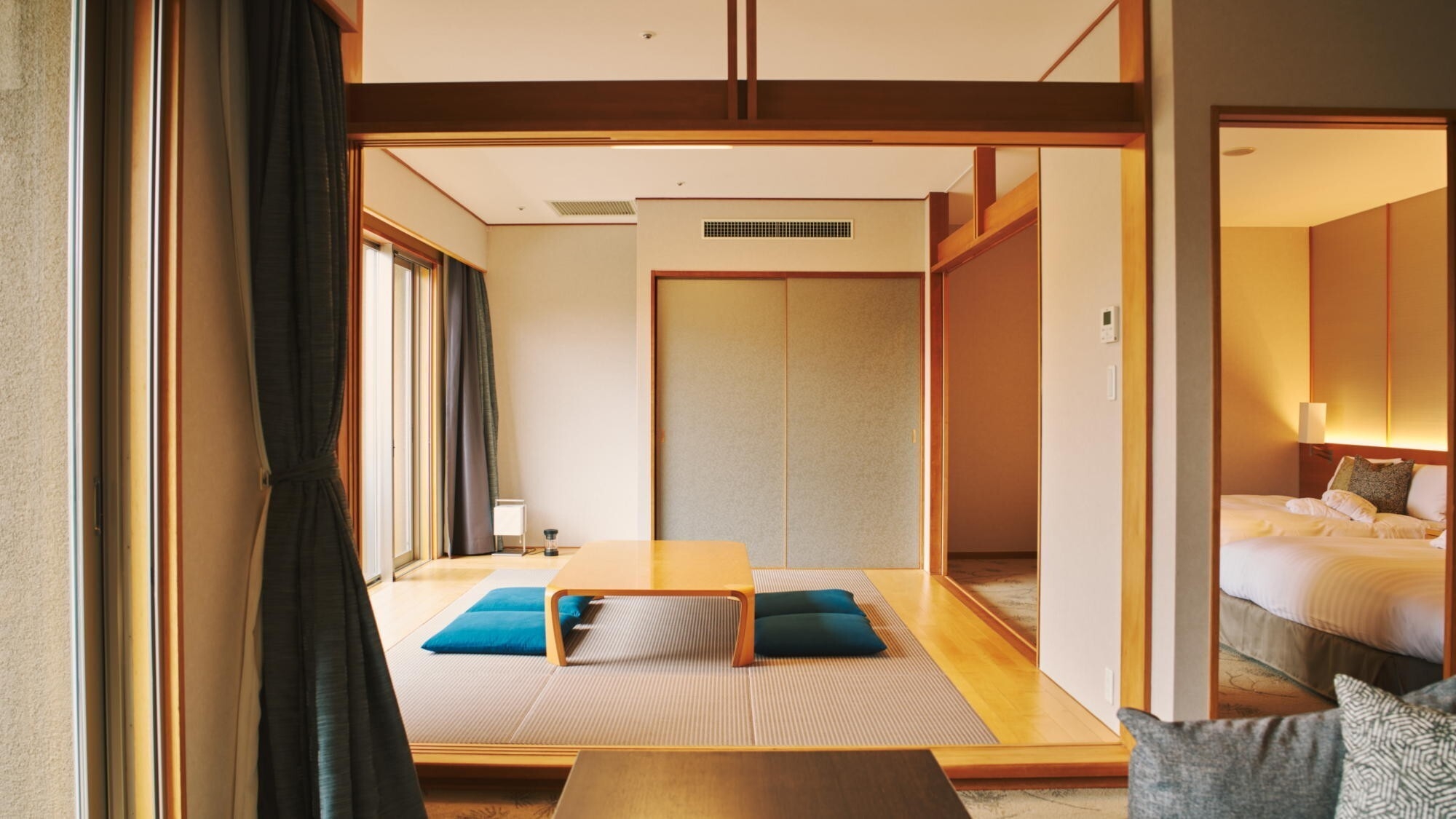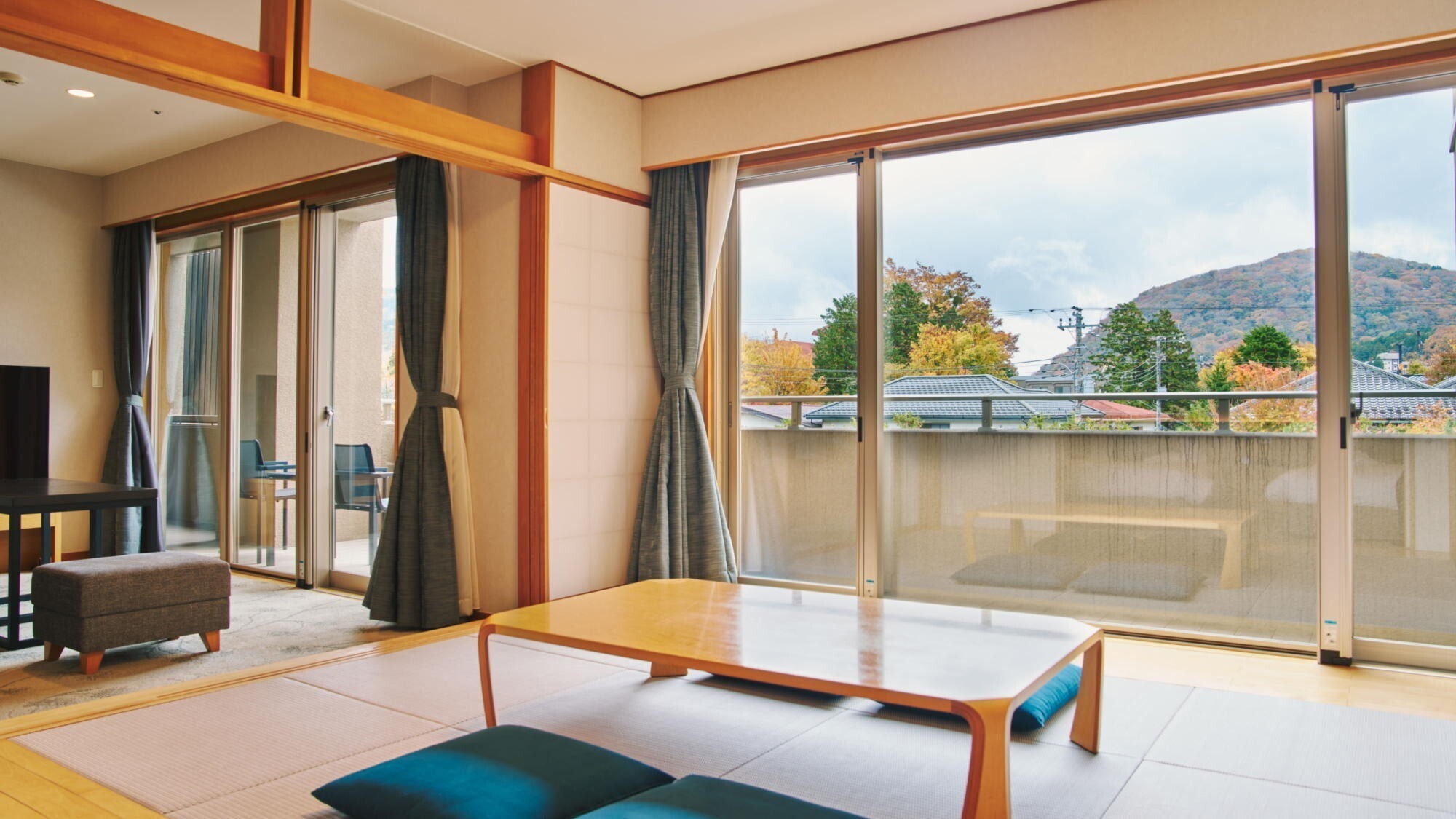 和室を備えた広々とした和洋室。お部屋の空間を自由にお使いいただけます。客室内温泉内風呂は新姥子温泉。客室内冷蔵庫のドリンクは無料でお楽しみいただけます。