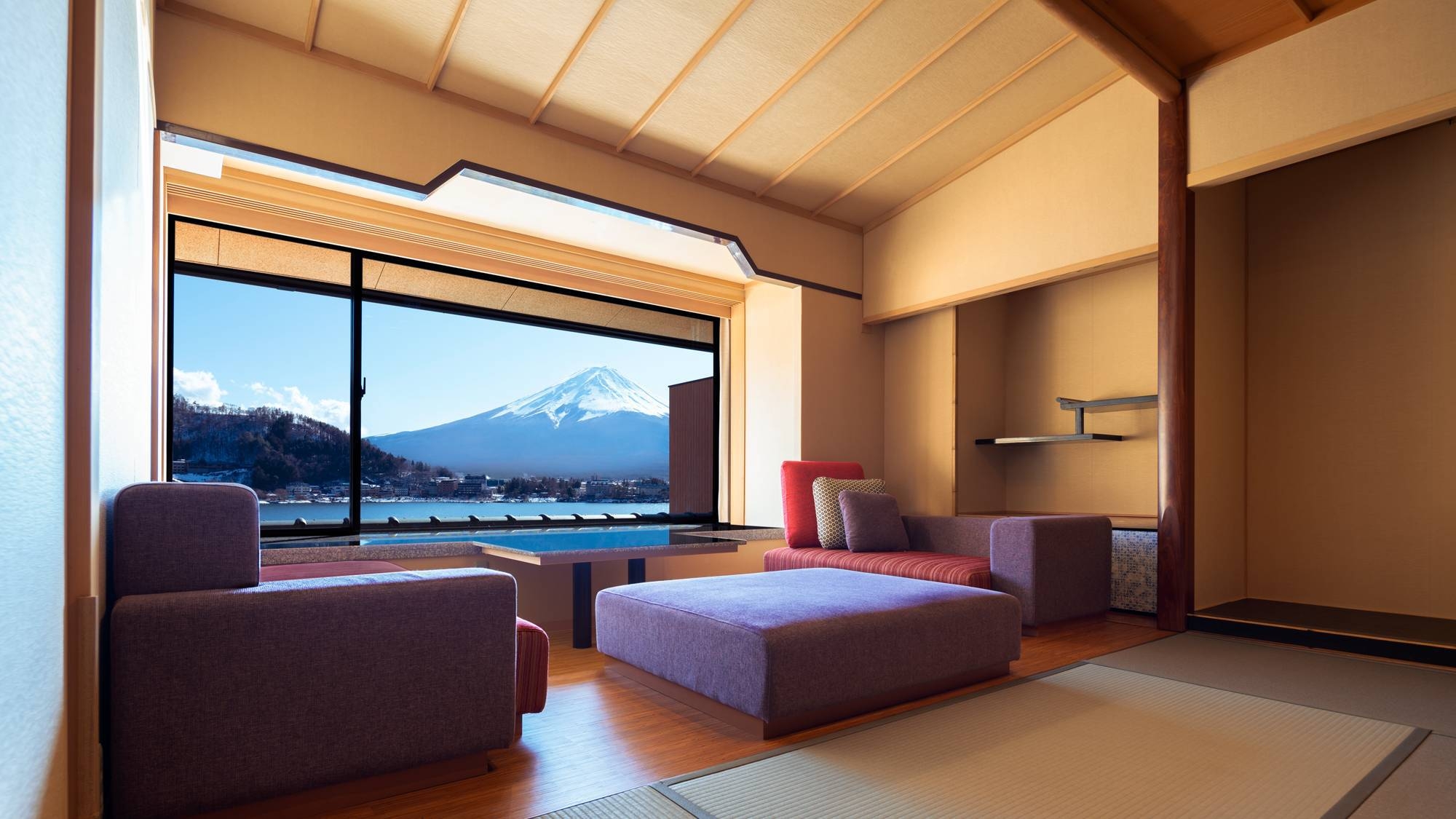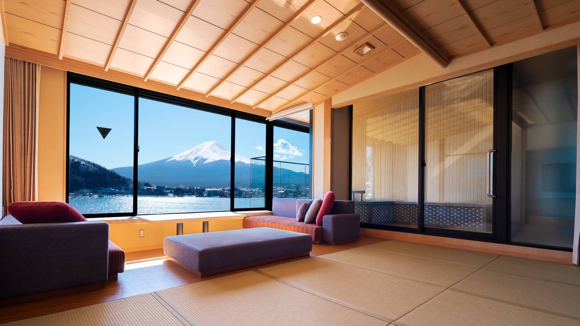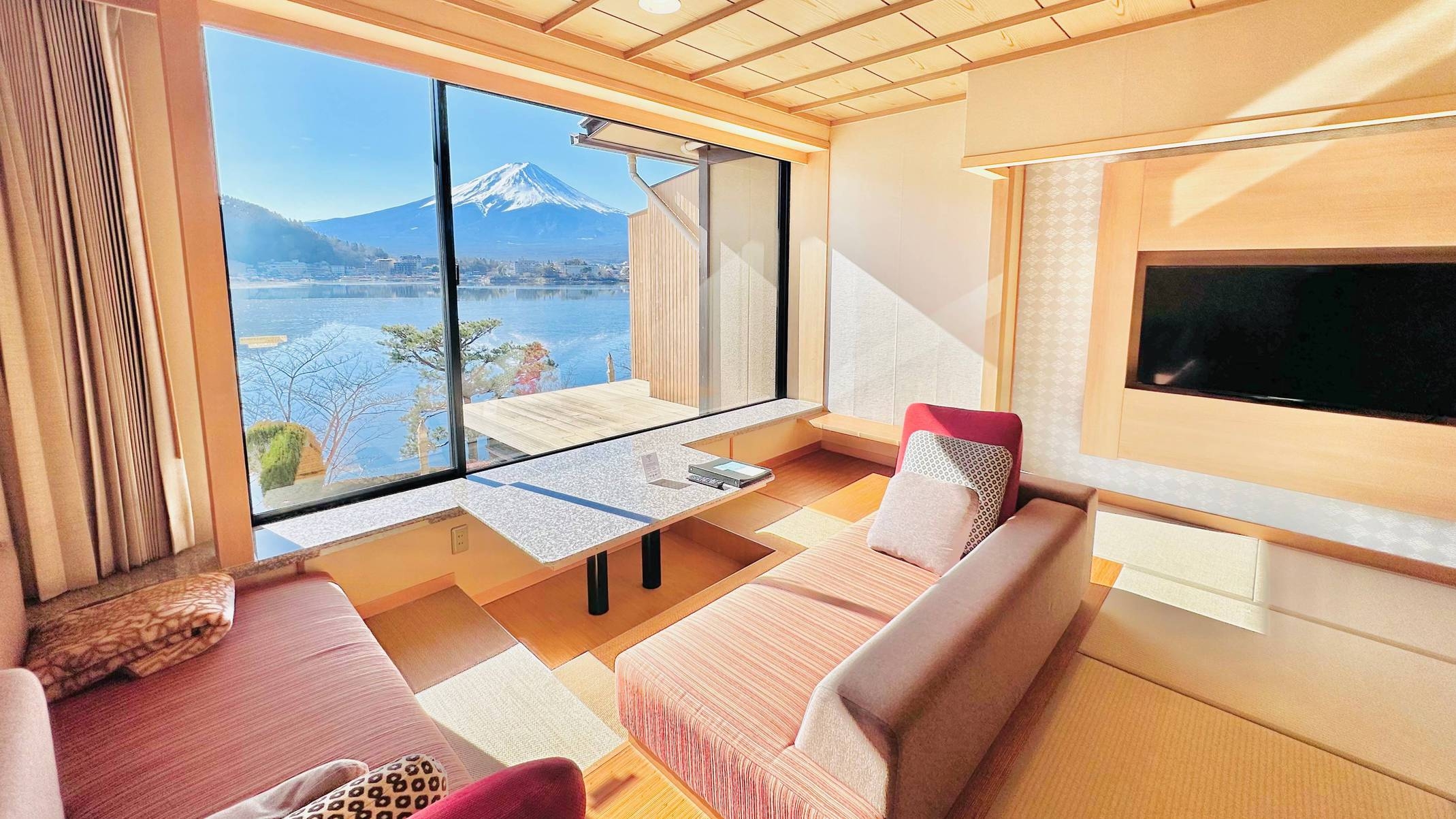 ■和室+リビング+ベッドルーム+露天風呂 ※温泉ではございません ■眺望:富士山、河口湖 ■夕食、朝食とも食事処