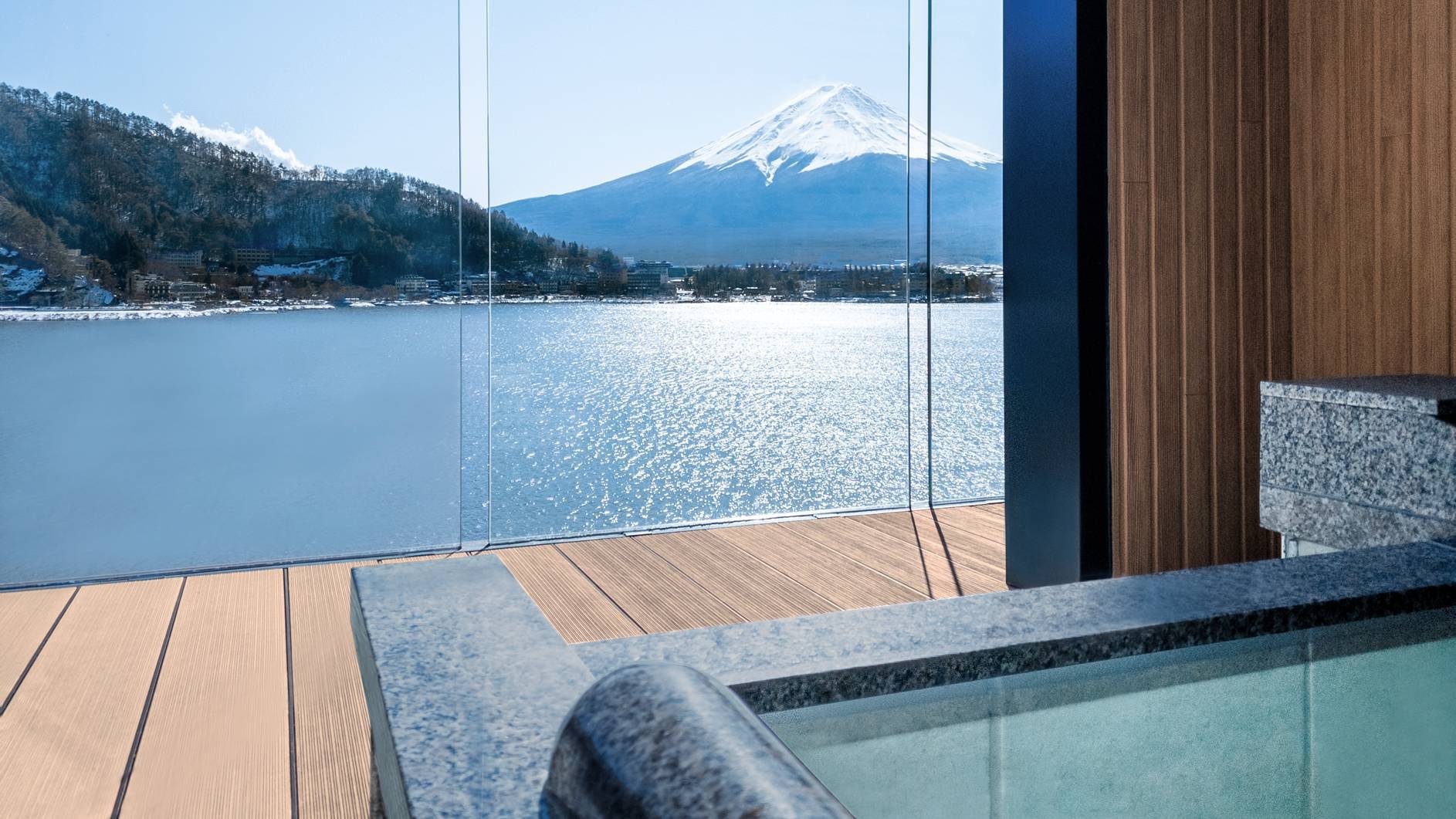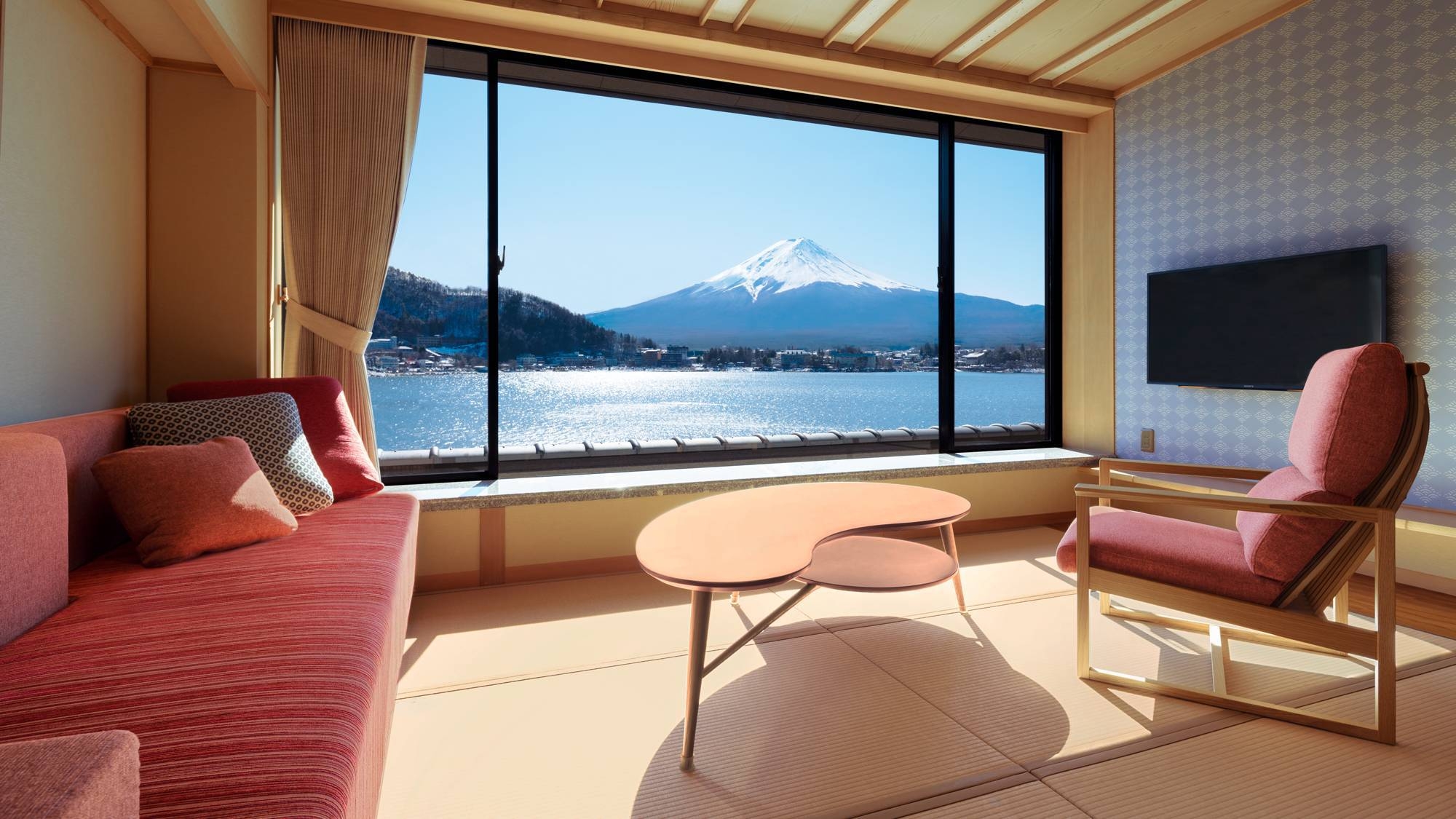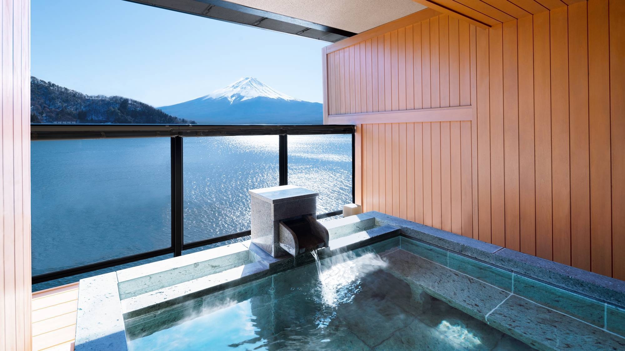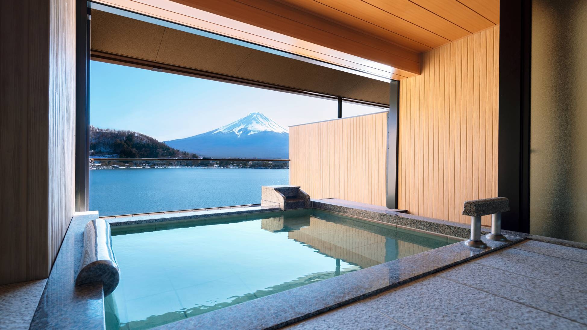 ■和室+リビング+ベッドルーム+露天風呂 ※温泉ではございません ■眺望:富士山、河口湖 ■夕食、朝食とも食事処