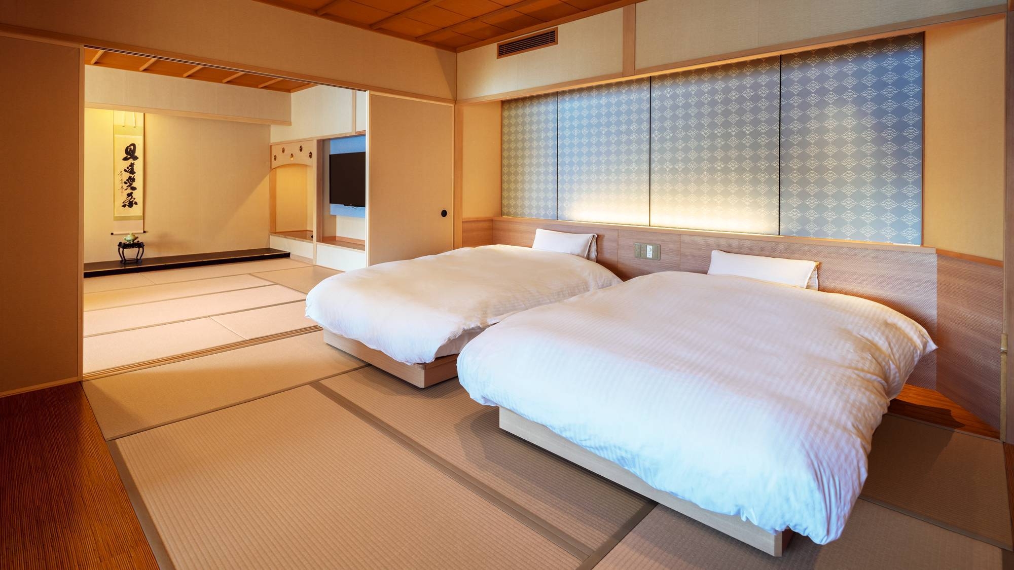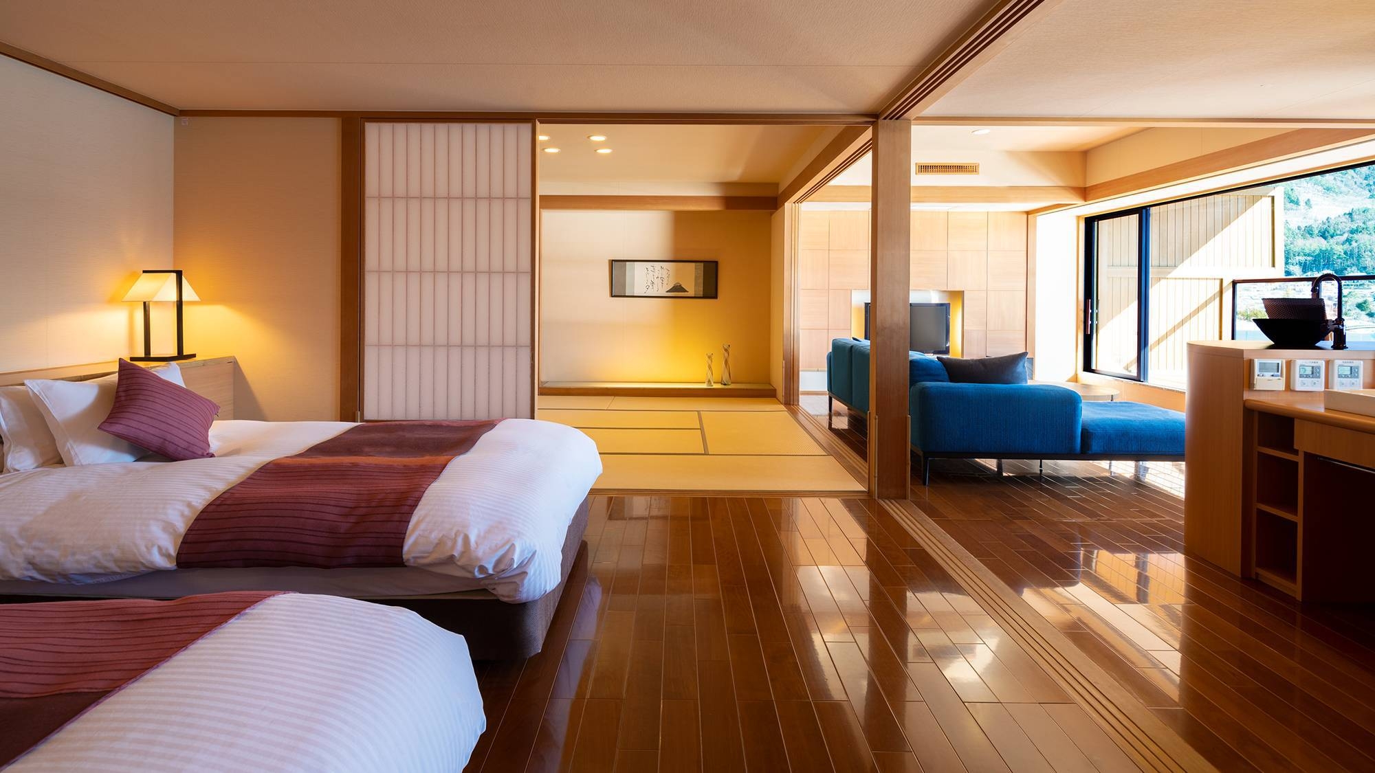■和室+リビング+ベッドルーム+露天風呂 ※温泉ではございません ■夕食、朝食とも食事処