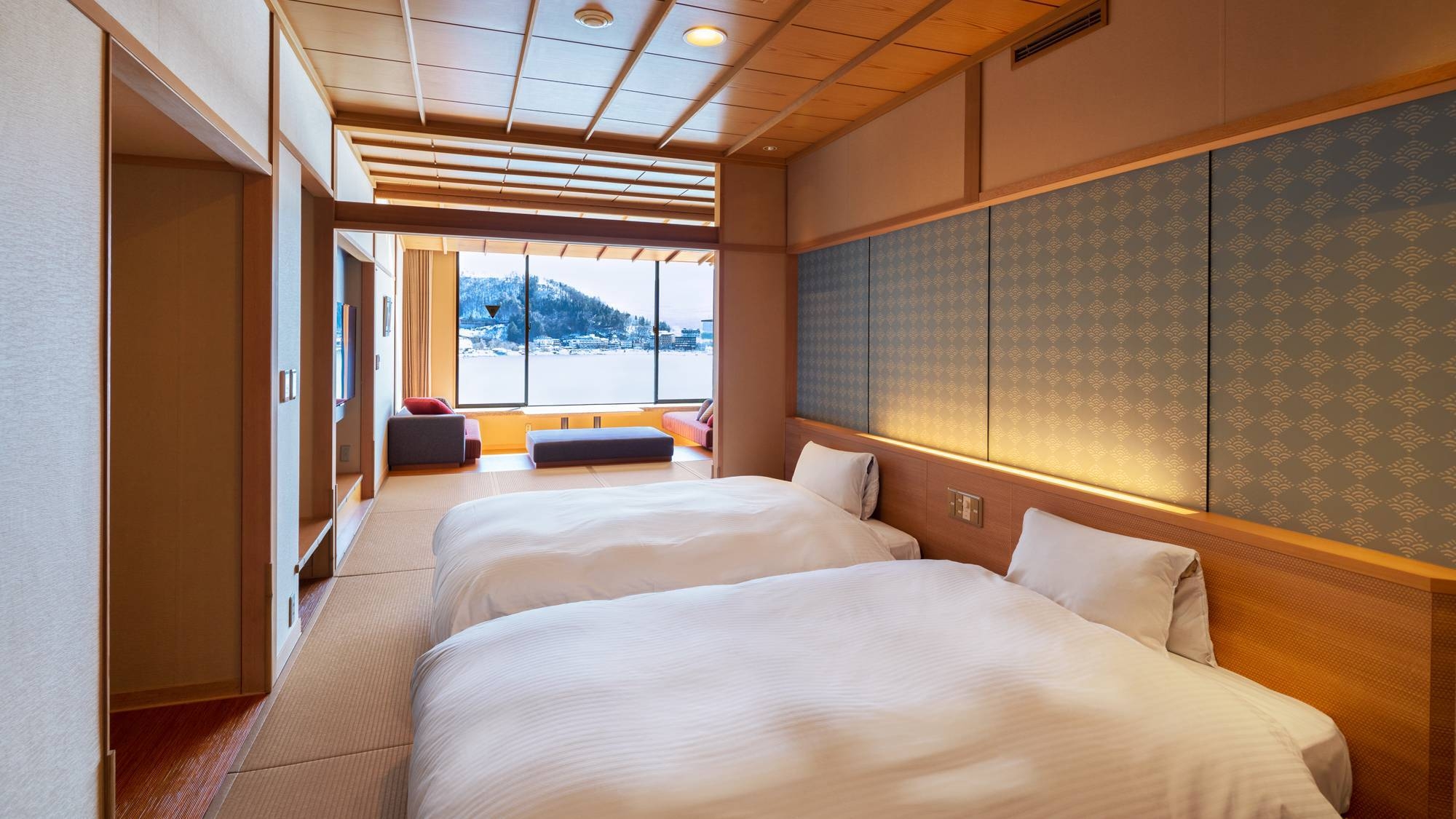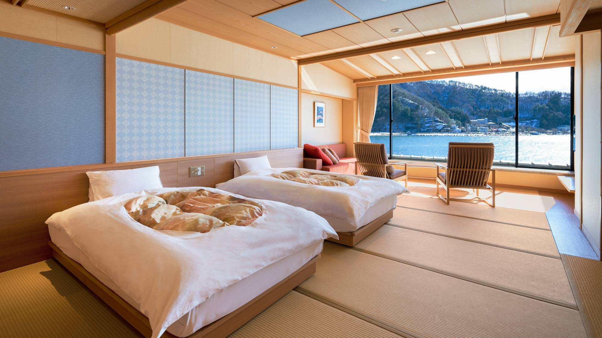 ■和室+ツインベッドルーム+露天風呂 ※温泉ではございません ■眺望:富士山、河口湖 ■夕食、朝食とも食事処