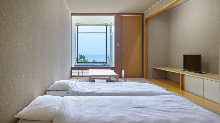 展望風呂付の和室に和ベッドを配置したツインルーム(約35平米)。目の前に広がる唐津湾を眺めながらのリラックスタイムをご堪能ください。