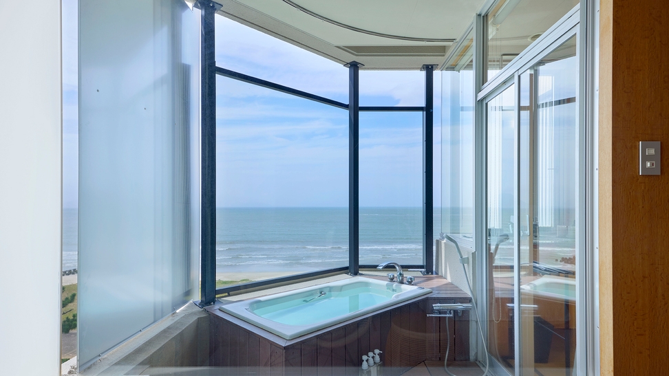 展望風呂付きの和室(約12畳)のお部屋。目の前に広がる唐津湾を眺めながら、癒しの入浴時間をお楽しみください。