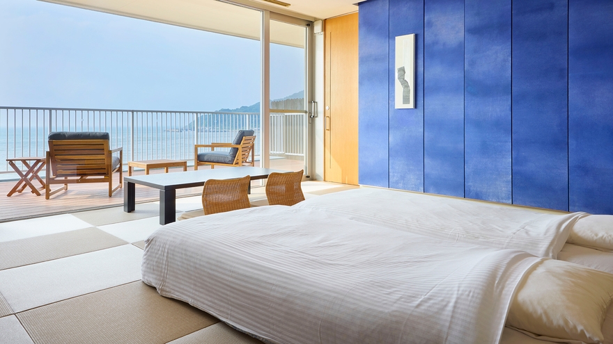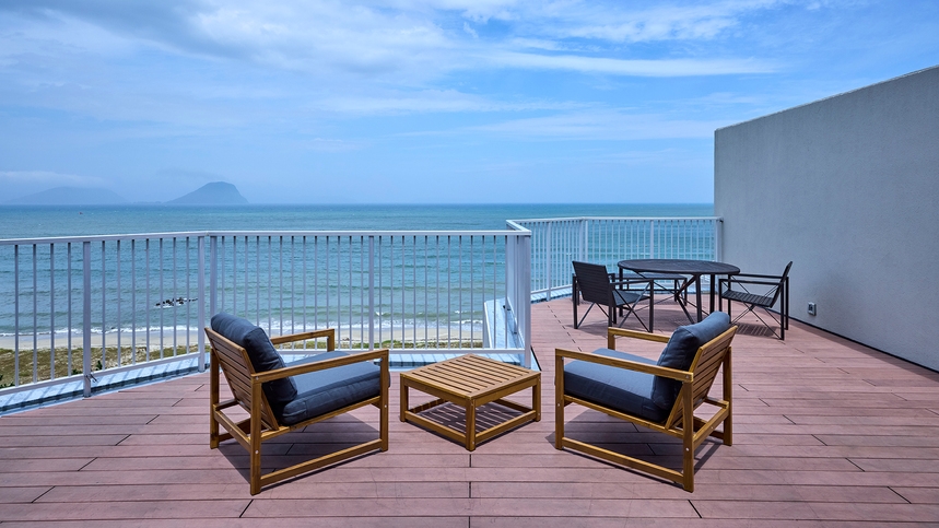 最上階の展望バルコニーを備えた和室(18畳)のお部屋。バルコニーからは唐津湾が一望でき、広がる海と空に包まれる、特別なひとときを演出します。