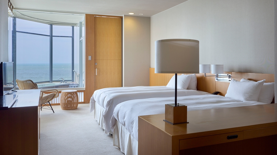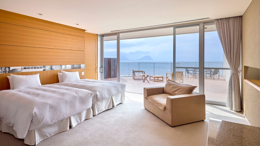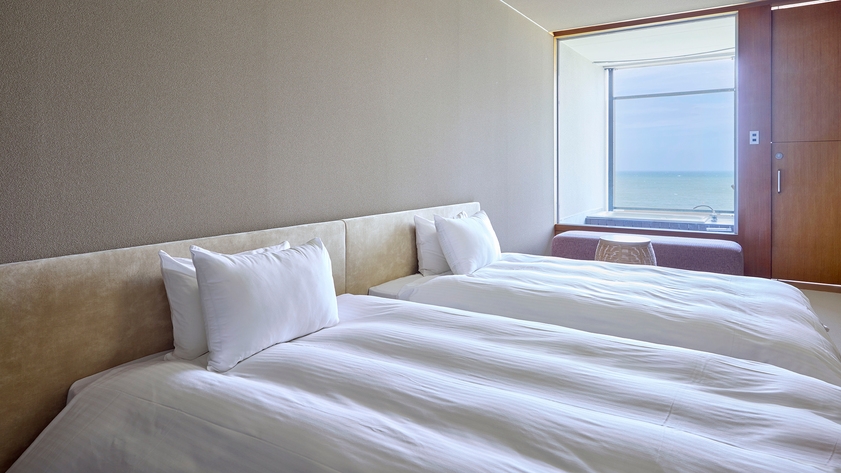 展望風呂付きのツインルーム(約30平米)。窓いっぱいに広がる唐津湾を眺めながら、極上のリラックスタイムをお過ごしください。