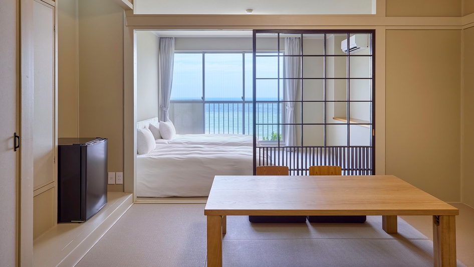 8畳の和室。唐津湾を一望できる静かな空間で海と波音に癒されるひとときをお過ごしください。