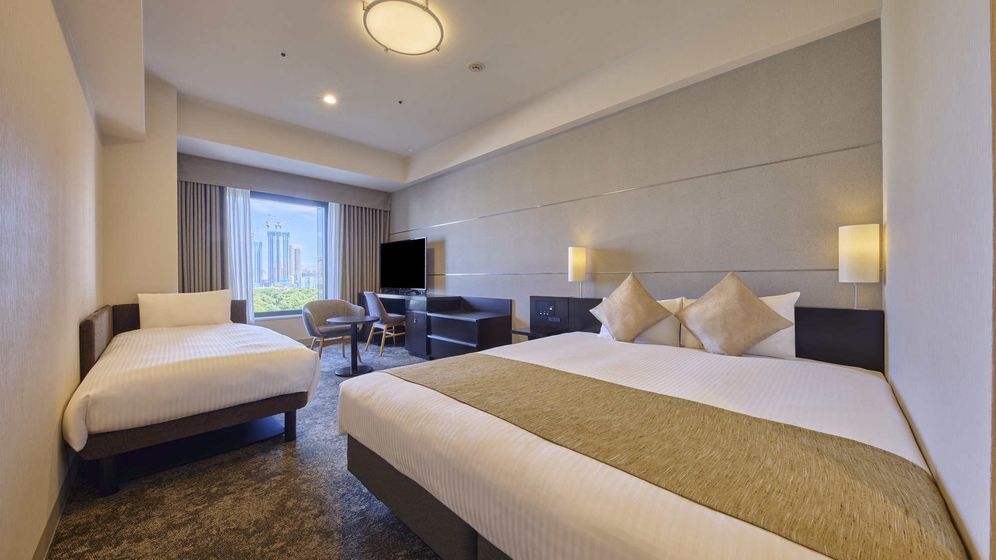 《2023年リニューアル》30平米|120×210ツインベッド|バス・トイレセパレート※4名利用の場合、ソファーベッド(95×200)・小ベッド(90×188)
