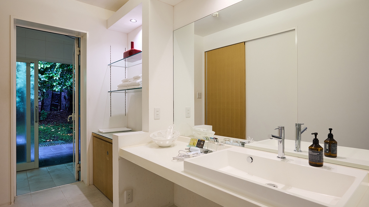 白を基調とした明るい雰囲気の離れ客室。和と洋の雰囲気をもつリラックスできる空間。内風呂付き。
