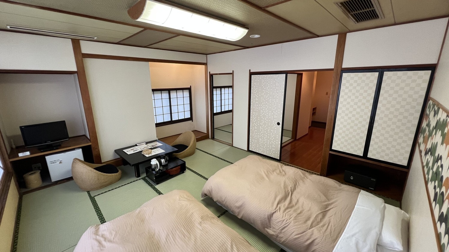 客室のご案内】 ◆広さ ツインベッド付和室10畳+和室4.5畳 〈禁煙〉 3名様までご宿泊可能。1名様は小さいお部屋にお布団を敷かせていただい