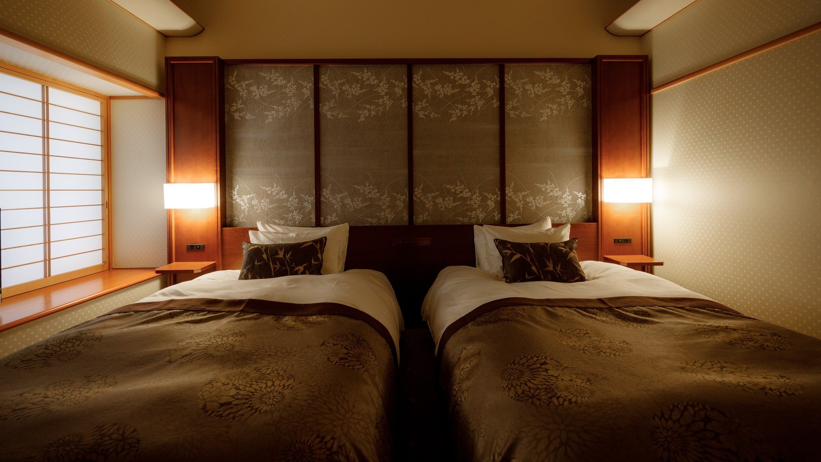 清流音信川に面したデラックスタイプのツインルーム。特別な記念日や、バリアフリーをご希望のお客様にお勧めする広めの洋室です。