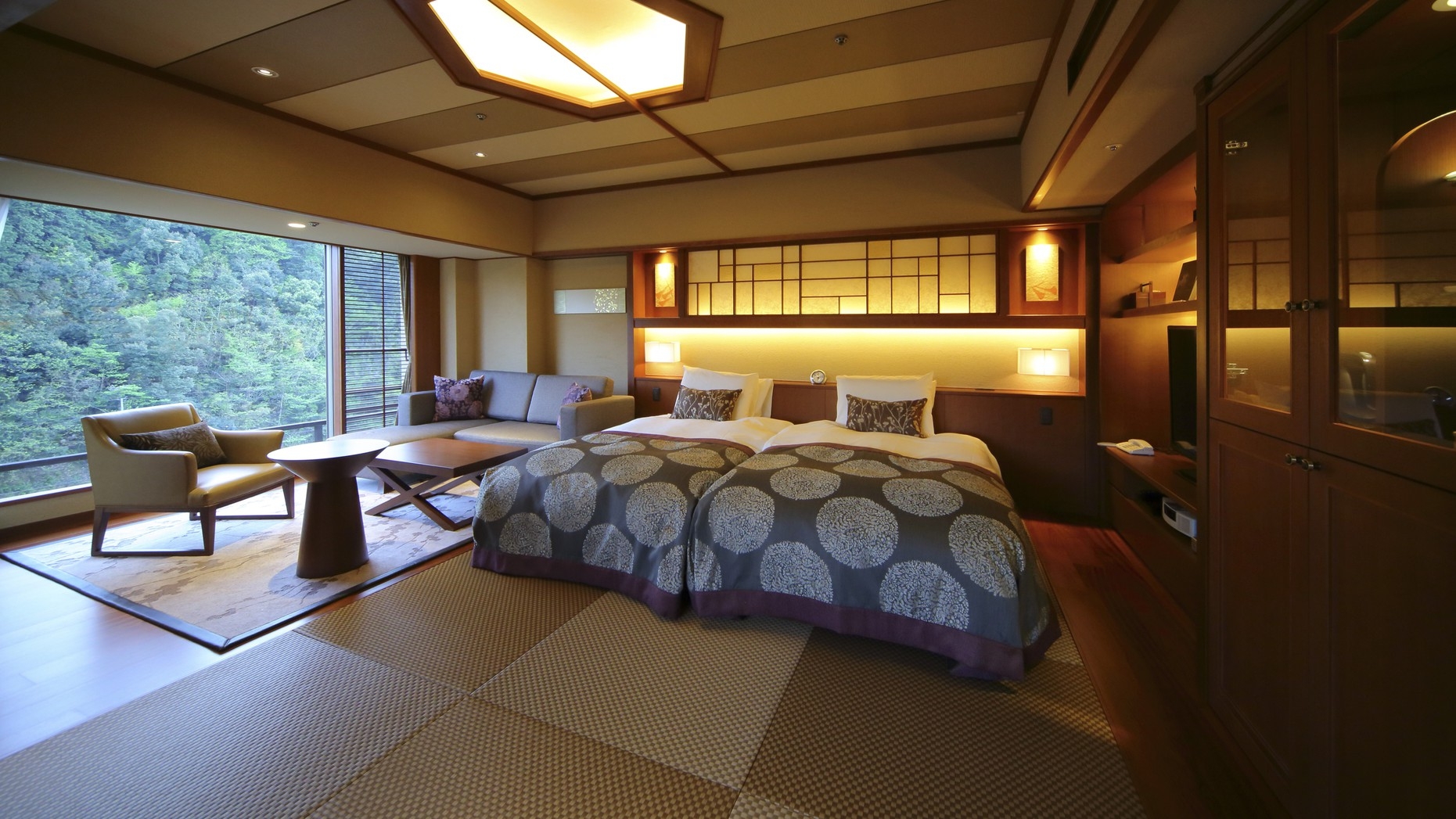 水と緑を近くに感じる大きな窓、琉球畳、120cm幅シモンズ社ベッドで心潤う休日※山側、渓流側露天風呂付ジュニアスイートのいずれか/当館お任せ※3名様は追加寝具