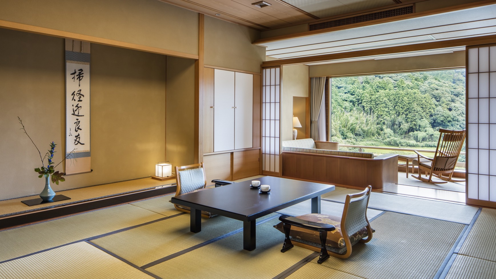 緑が視界に広がる客室。湯上りが心地よいテラスで心潤う休日を。※山側、川側スイートのいずれか/当館お任せ※追加寝具…3名様利用は1台、4名様利用は2台用意