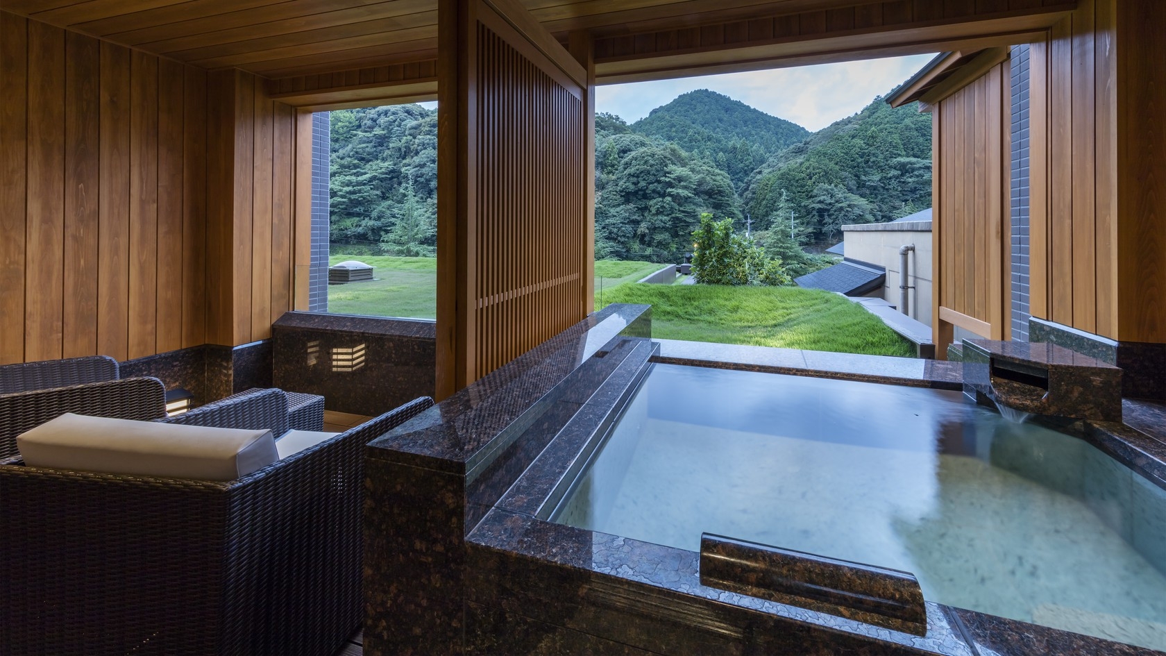 贅沢な120㎡の客室には、源泉かけ流しの露天風呂、