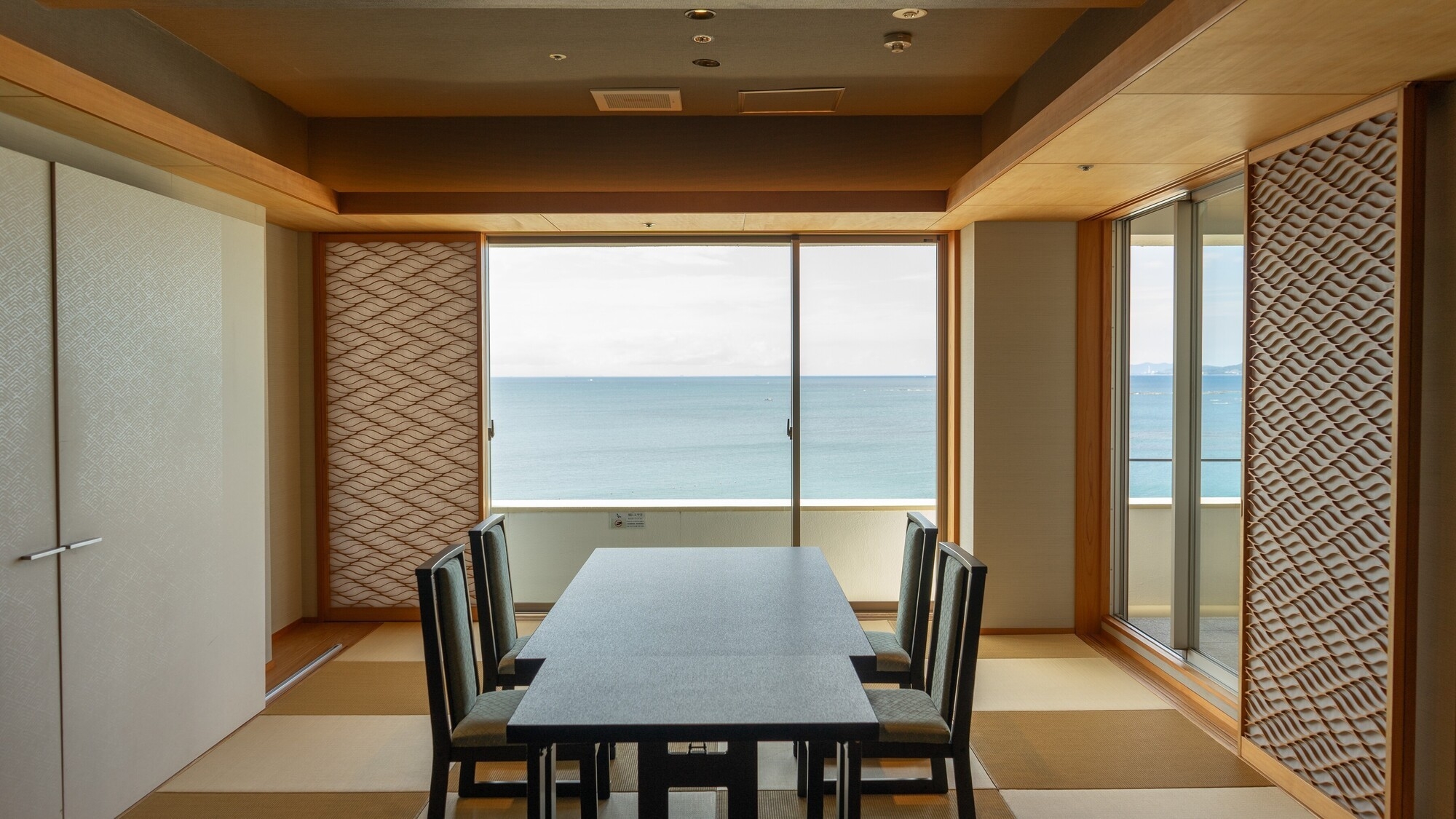 〜全室オーシャンビュー〜高層階8Fの露天風呂付客室「浜水晶」の和室10畳。良質な温泉を客室内の露天風呂で※夜中1時から5時は温泉が止まります。