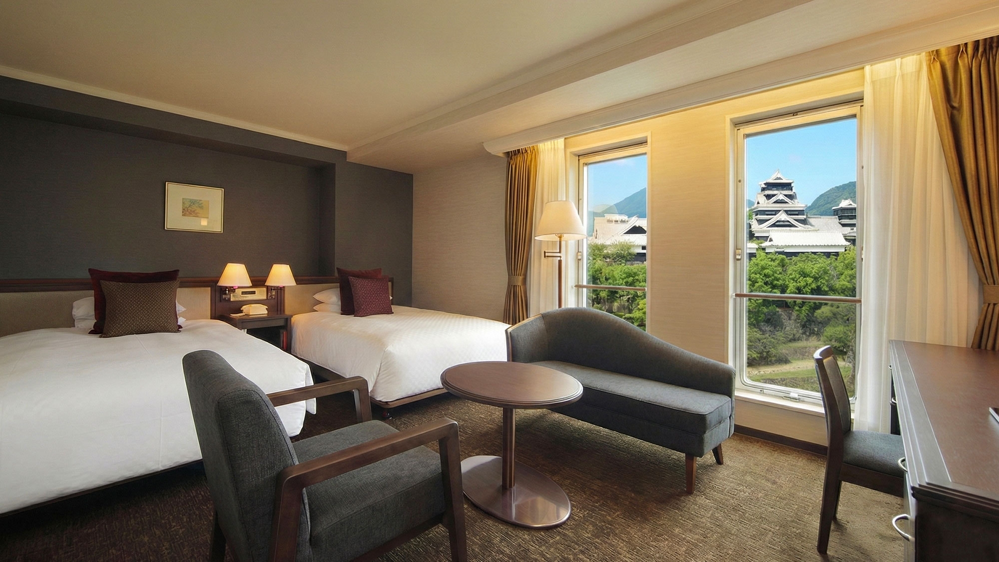 熊本城側のロケーション。ベッドサイズ:195cm-240cm ベビーベッド:× ※お部屋内のミニバーもご利用いただけます。