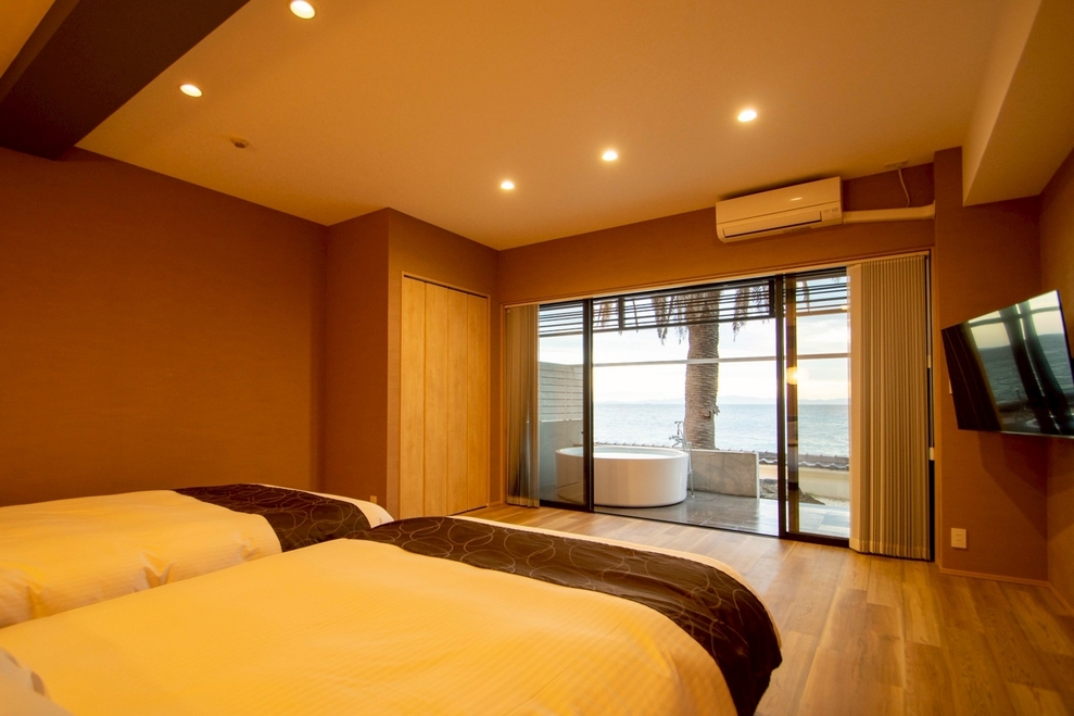 Wサイズベッド2台・4人掛けダイニングテーブル・洗面・トイレ・シャワールーム・テラス浴槽(セルフ給湯式)