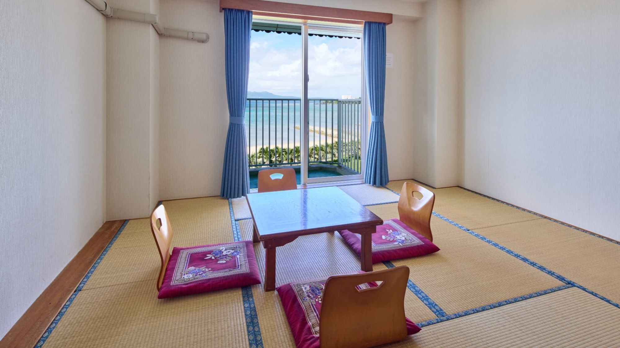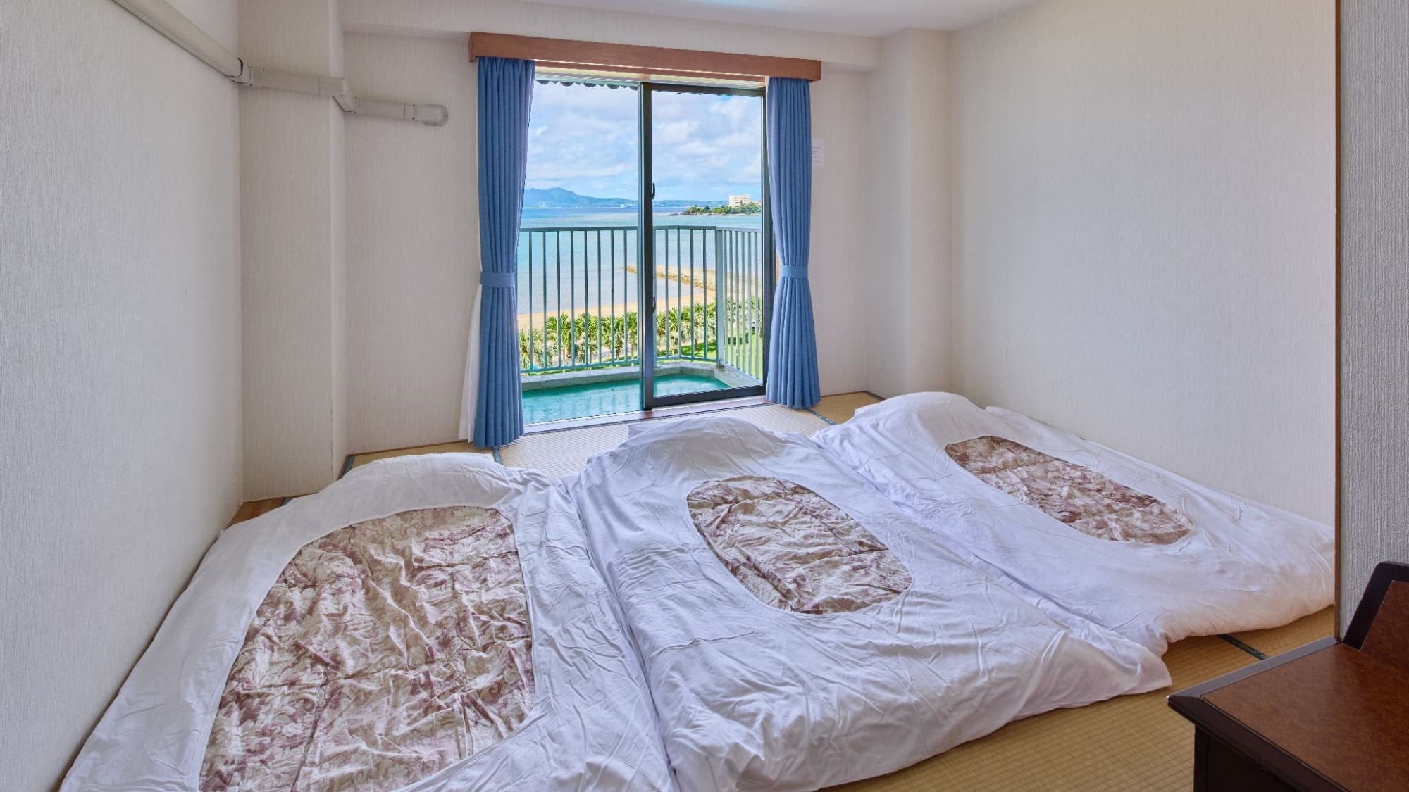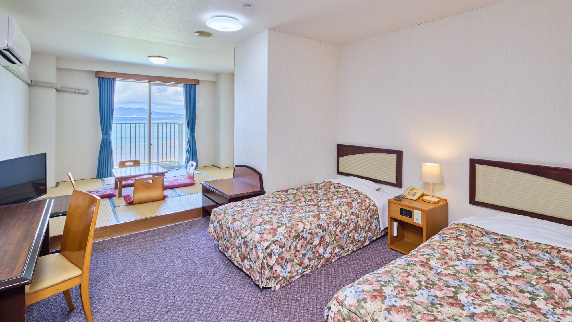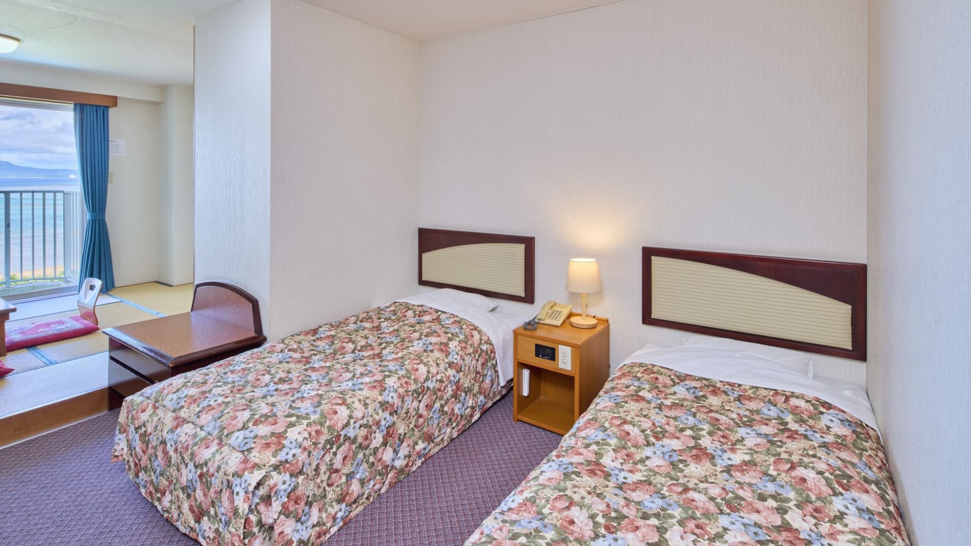 全室オーシャンビュー確約!畳間とツインベットがある34平米のオーシャンビュー和洋室で、バルコニーからはエメラルドグリーンの絶景パノラマビュー♪