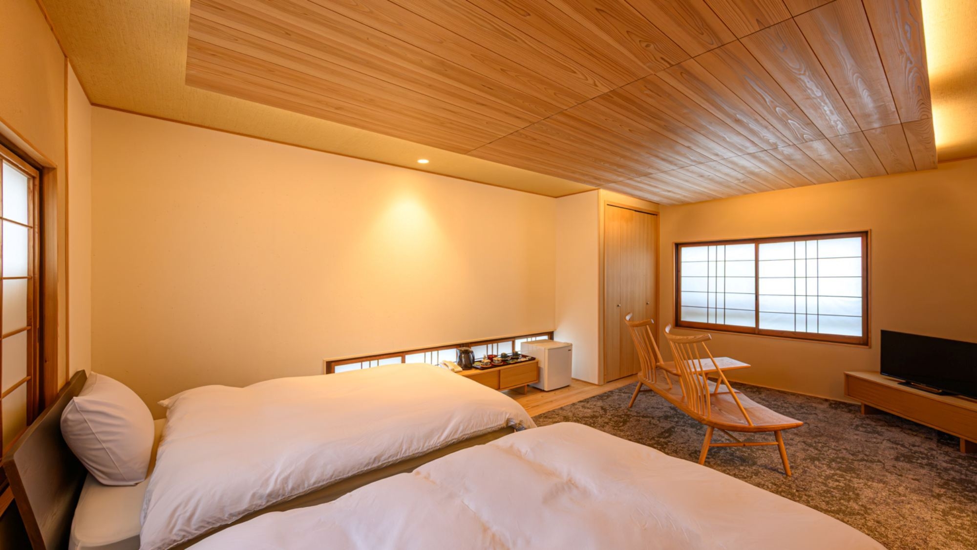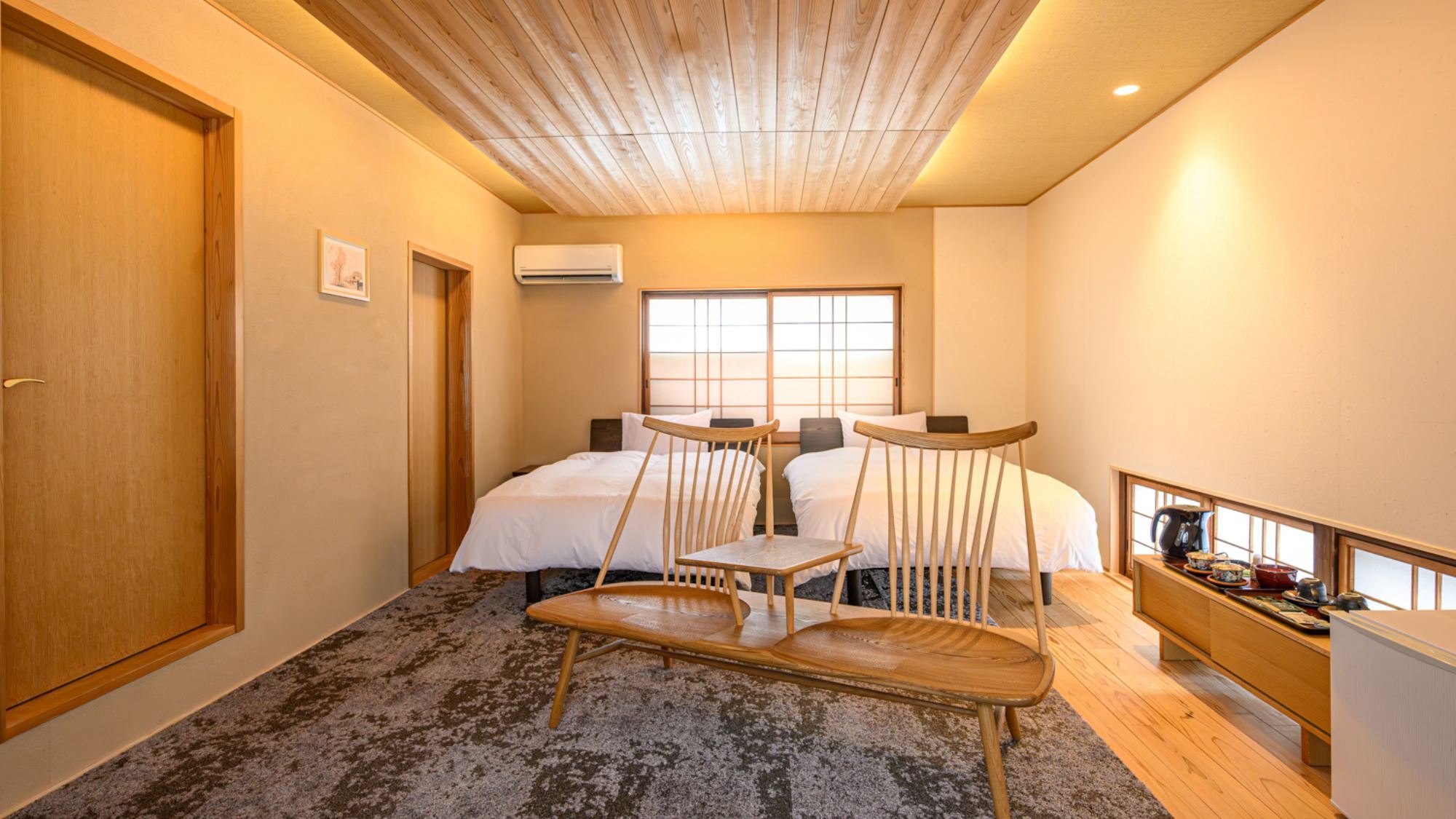■バス(檜風呂)・トイレ(温水洗浄便座付)はセパレートタイプ■囲炉裏のお部屋と寝室(ツインベッド)に分かれております。昔の農家をイメージした造り。