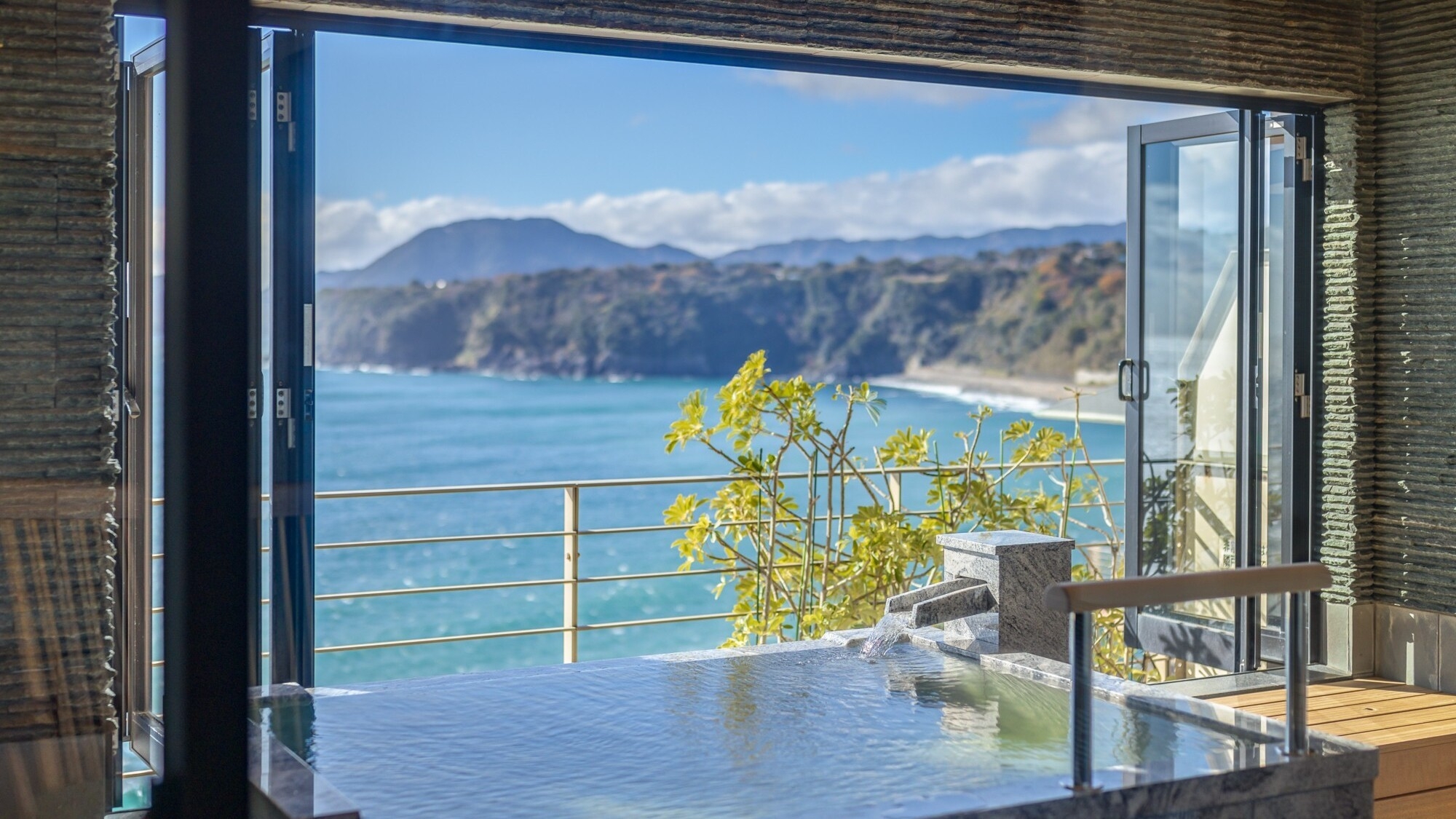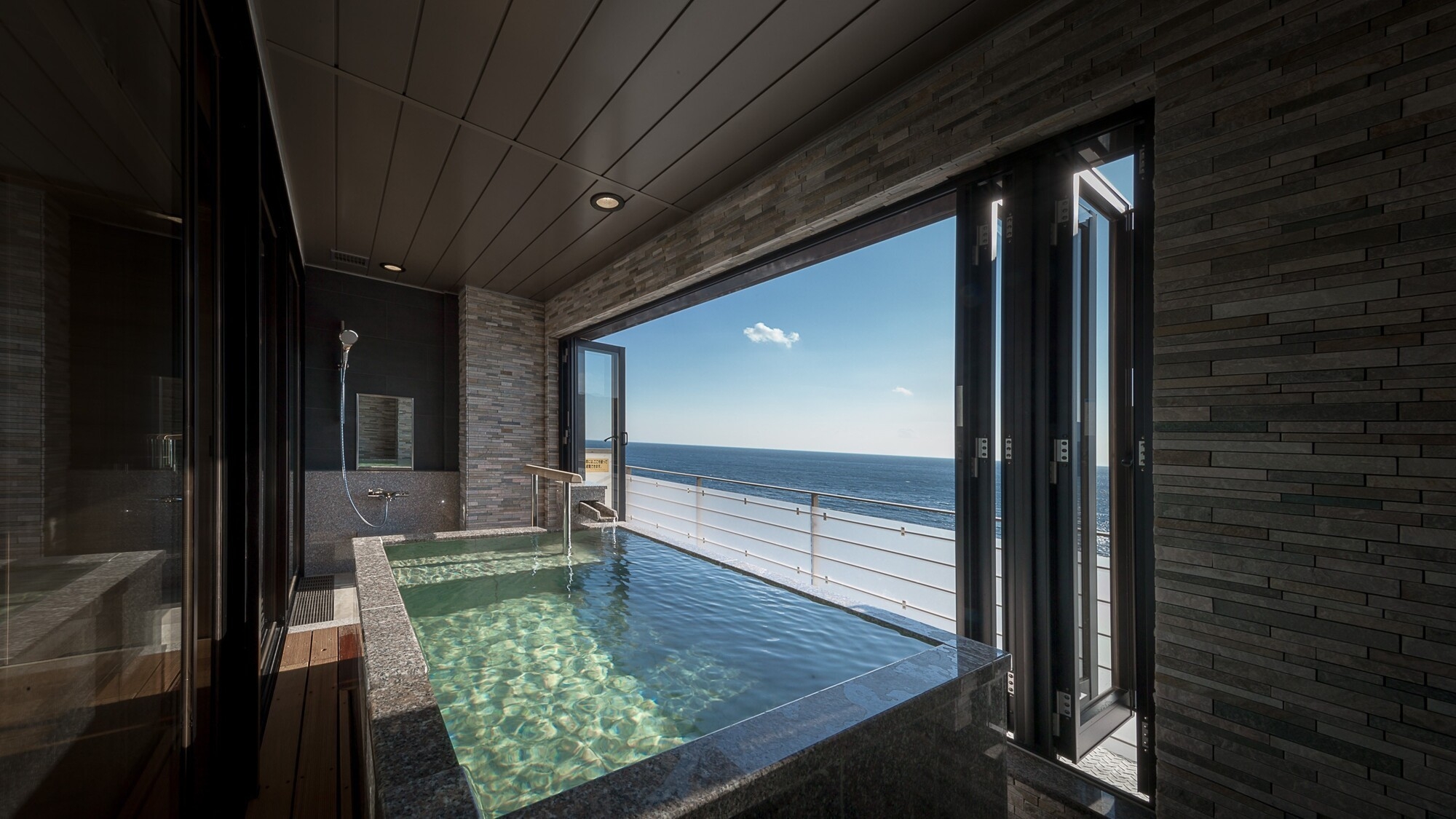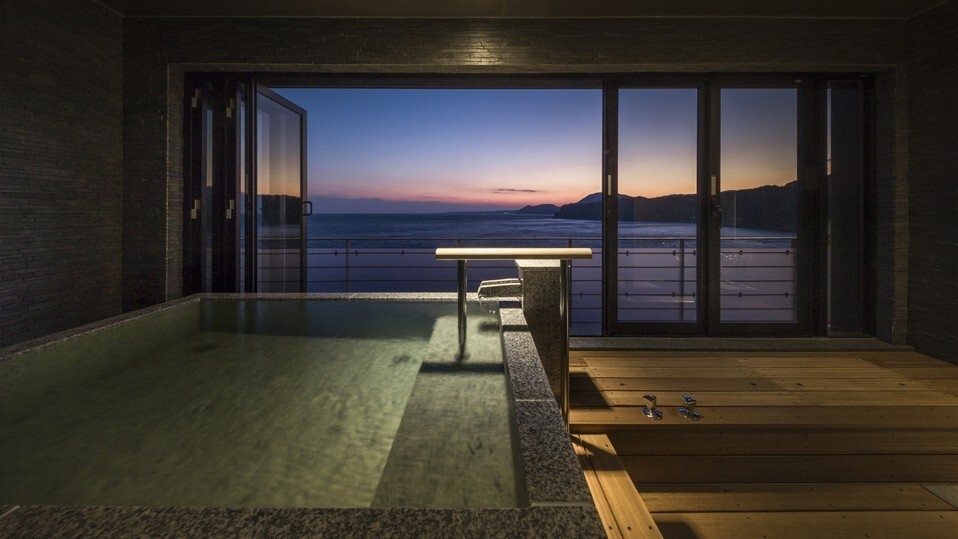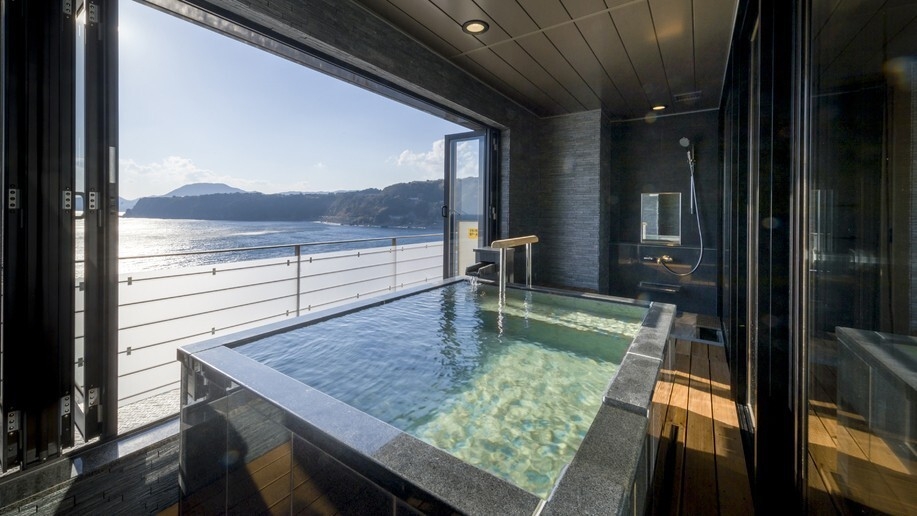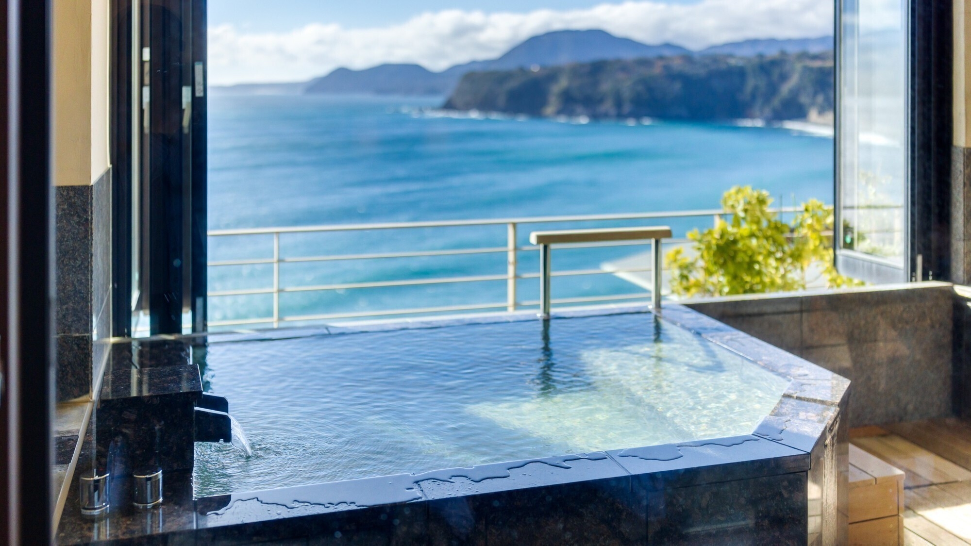 客室に備わる展望露天風呂は自家源泉のやわらかな稲取温泉をお愉しみいただけます。