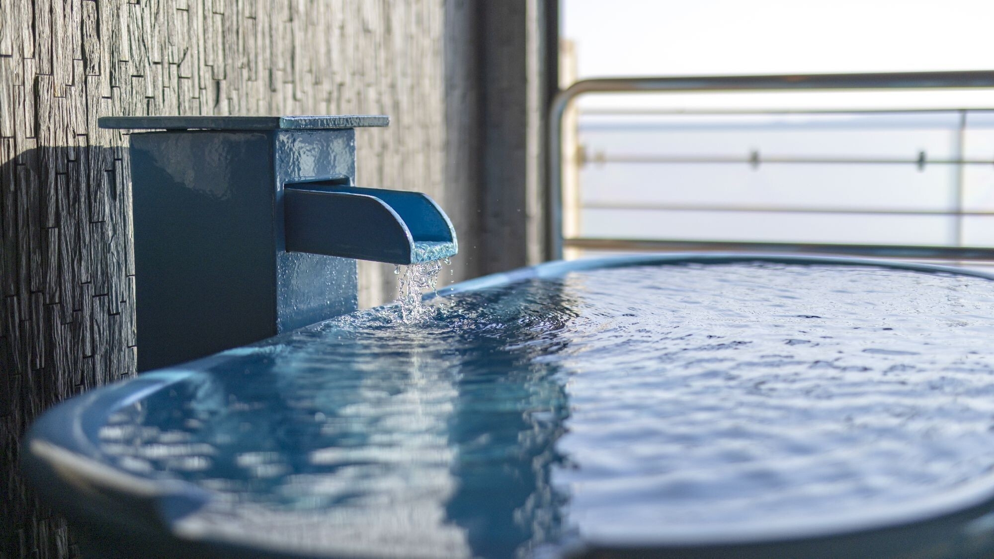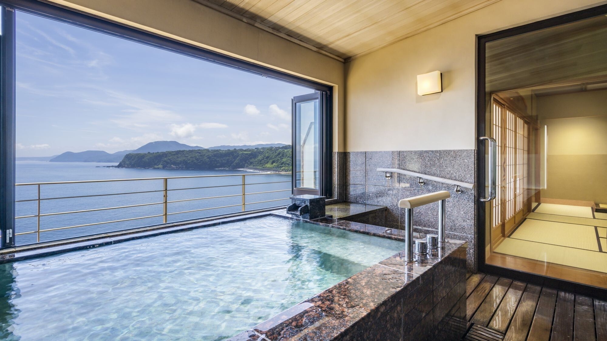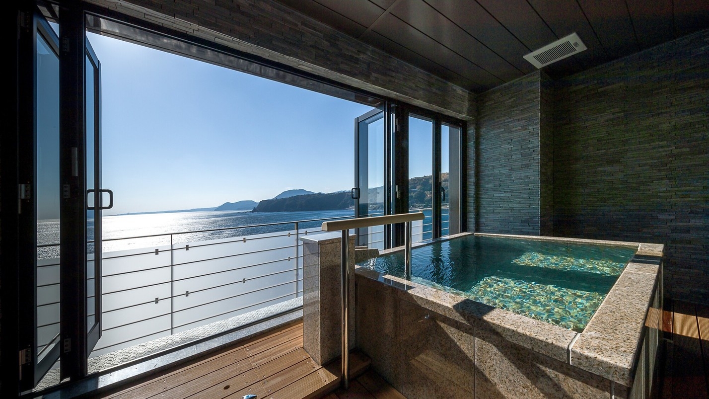客室に備わる展望露天風呂は自家源泉のやわらかな稲取温泉をお愉しみいただけます。