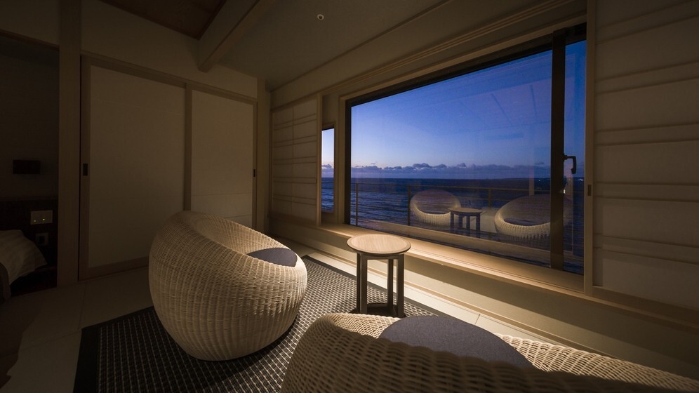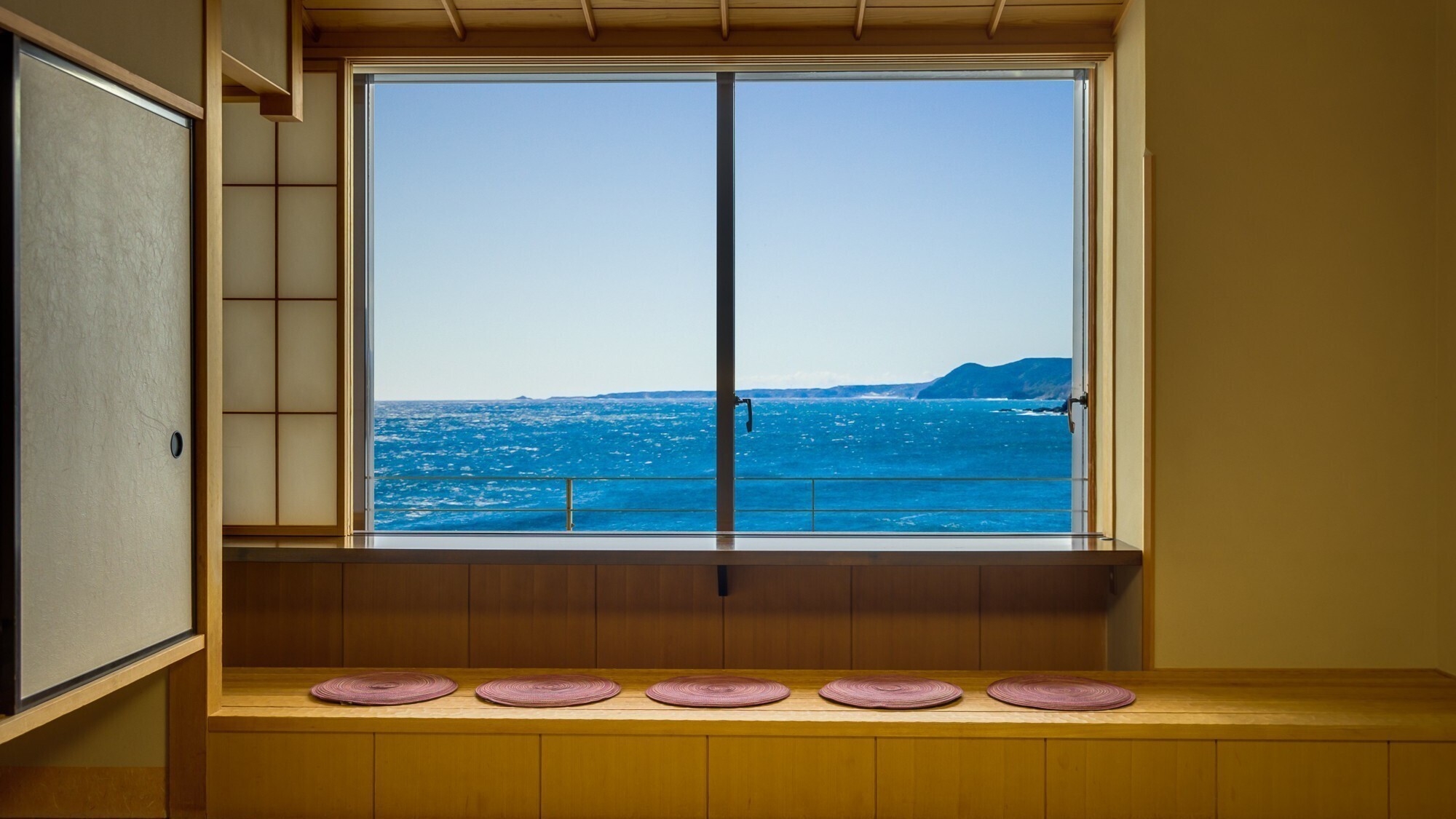 海を見渡せる窓辺のカウンターテーブルで語り合う。 大人の休日にぴったりな露天風呂付客室です。