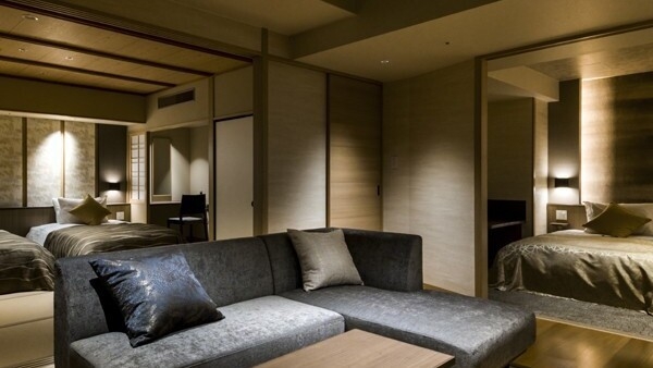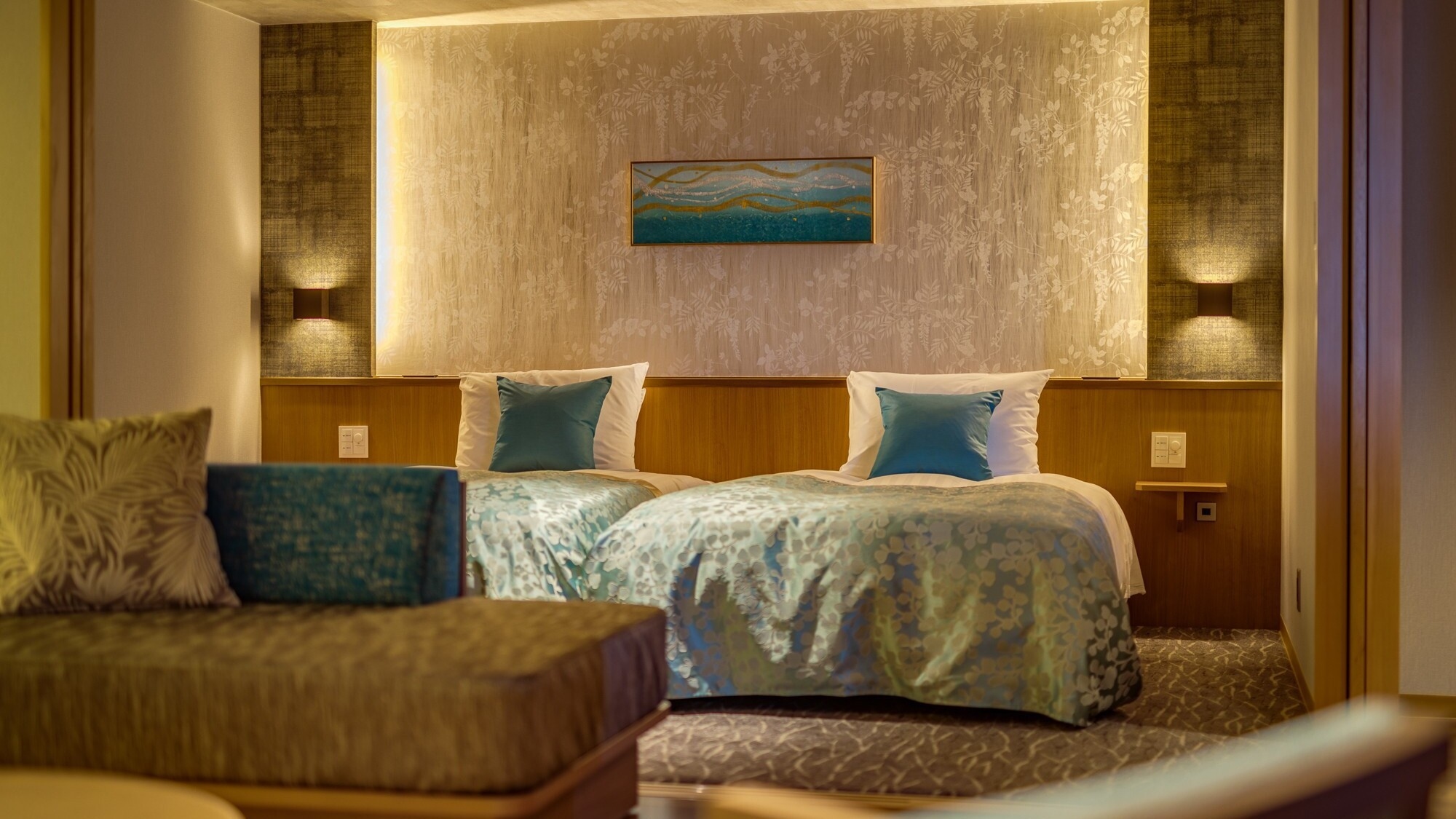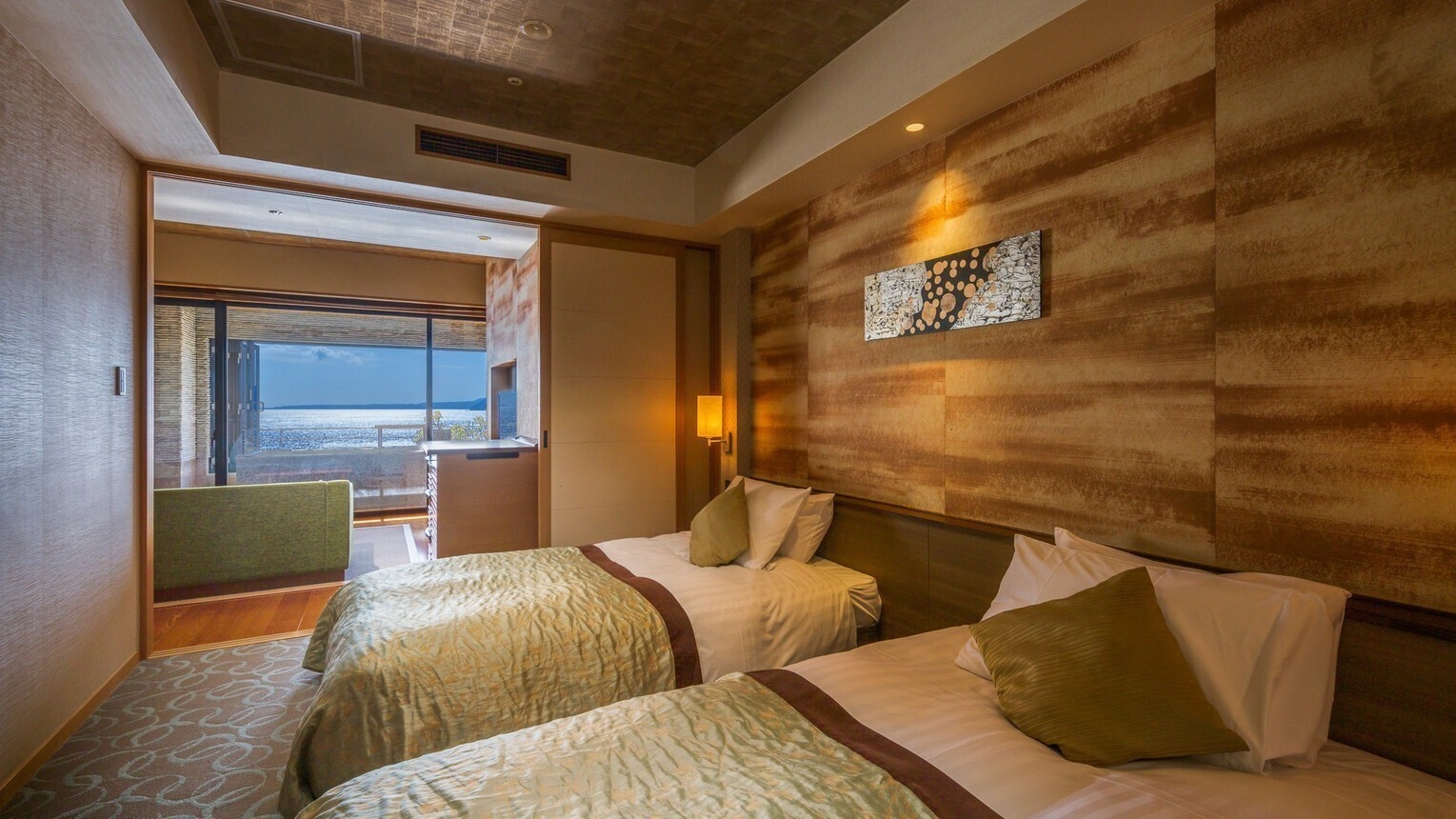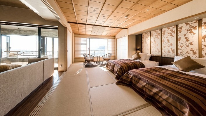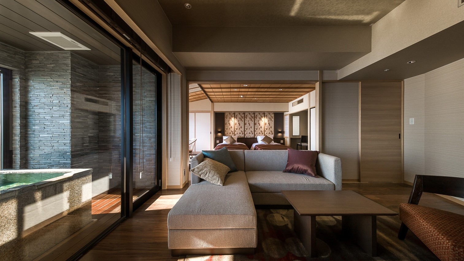6階ラグジュアリースイート4ベッドの露天風呂付客室。和室(ツイン)+洋室(ツイン)+リビング+露天風呂