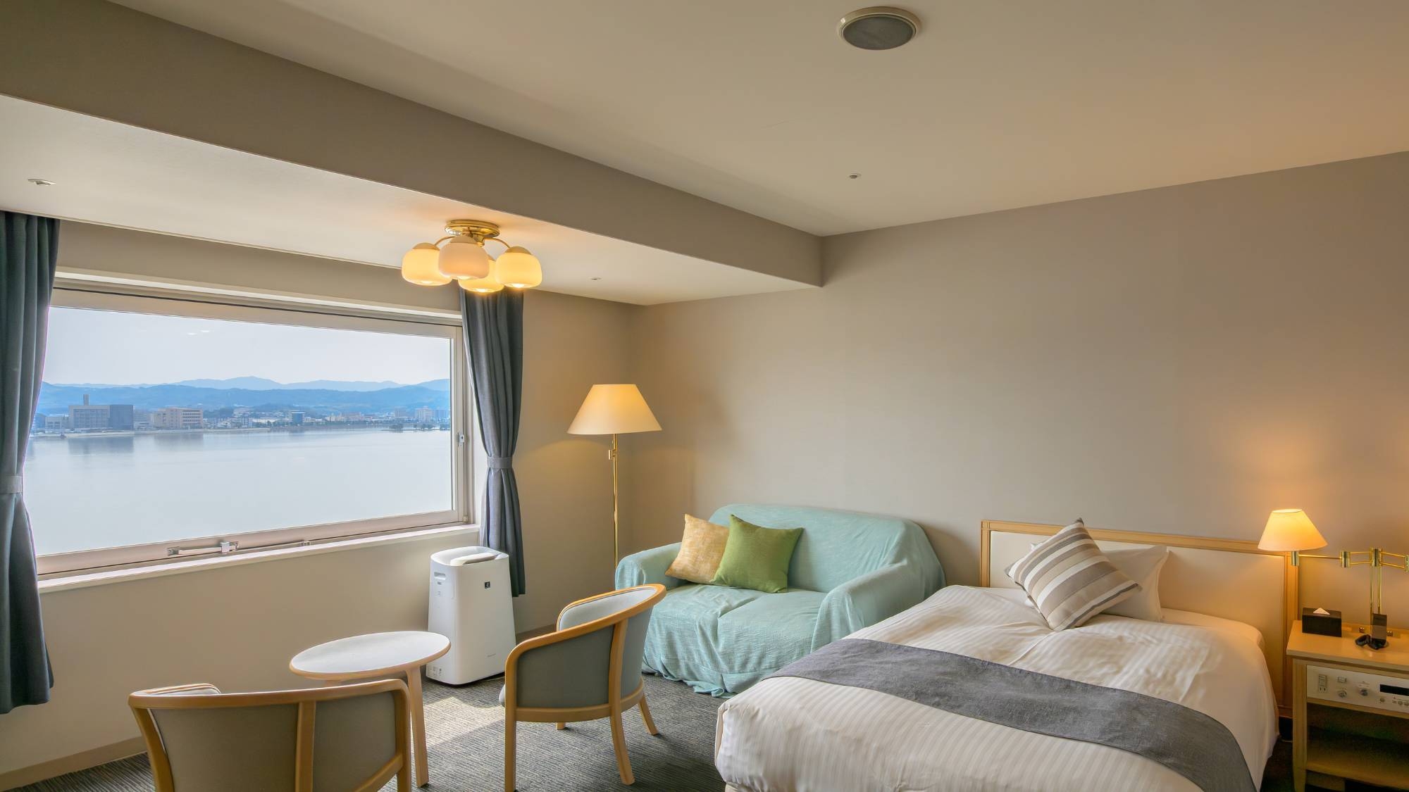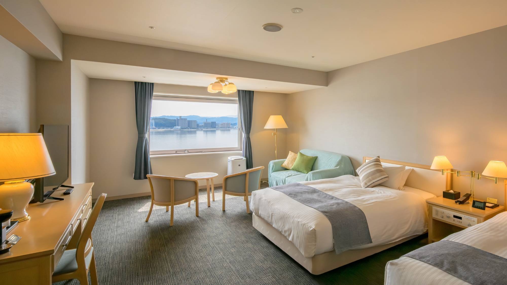 ご家族やグループでのご利用におすすめのトリプルルーム。 宍道湖を一望する大きな窓から光が差し込む明るいお部屋です。