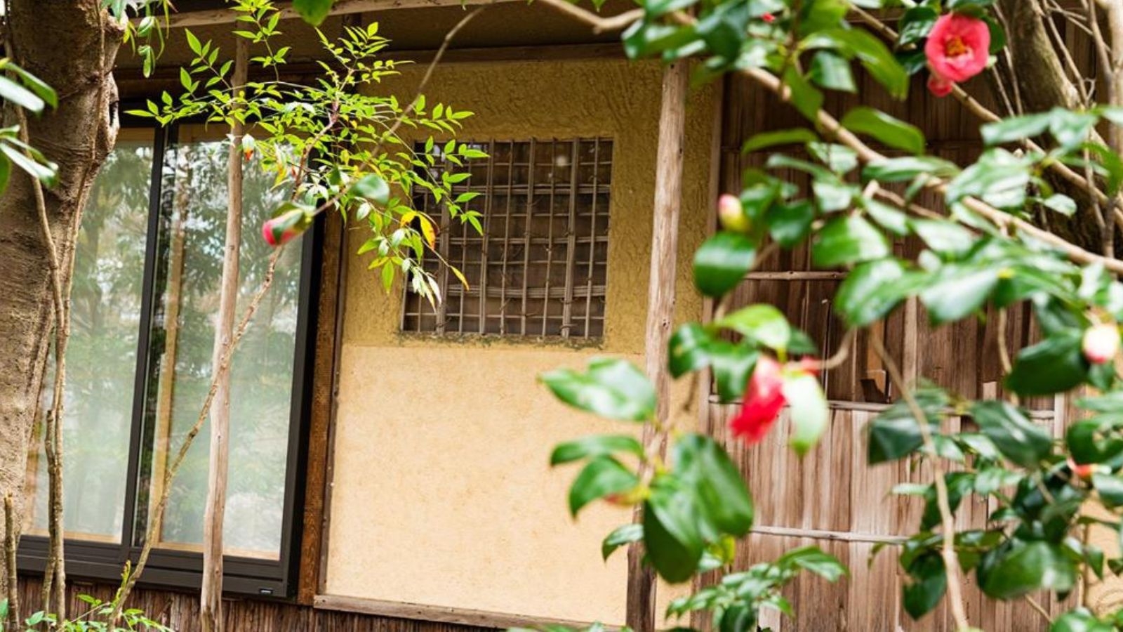 かつて藤棚を望んだ部屋。現在は春の桜、夏の新緑、秋の紅葉、冬の椿と、季節ごとの自然美を静かに楽しめる落ち着いた空間です。