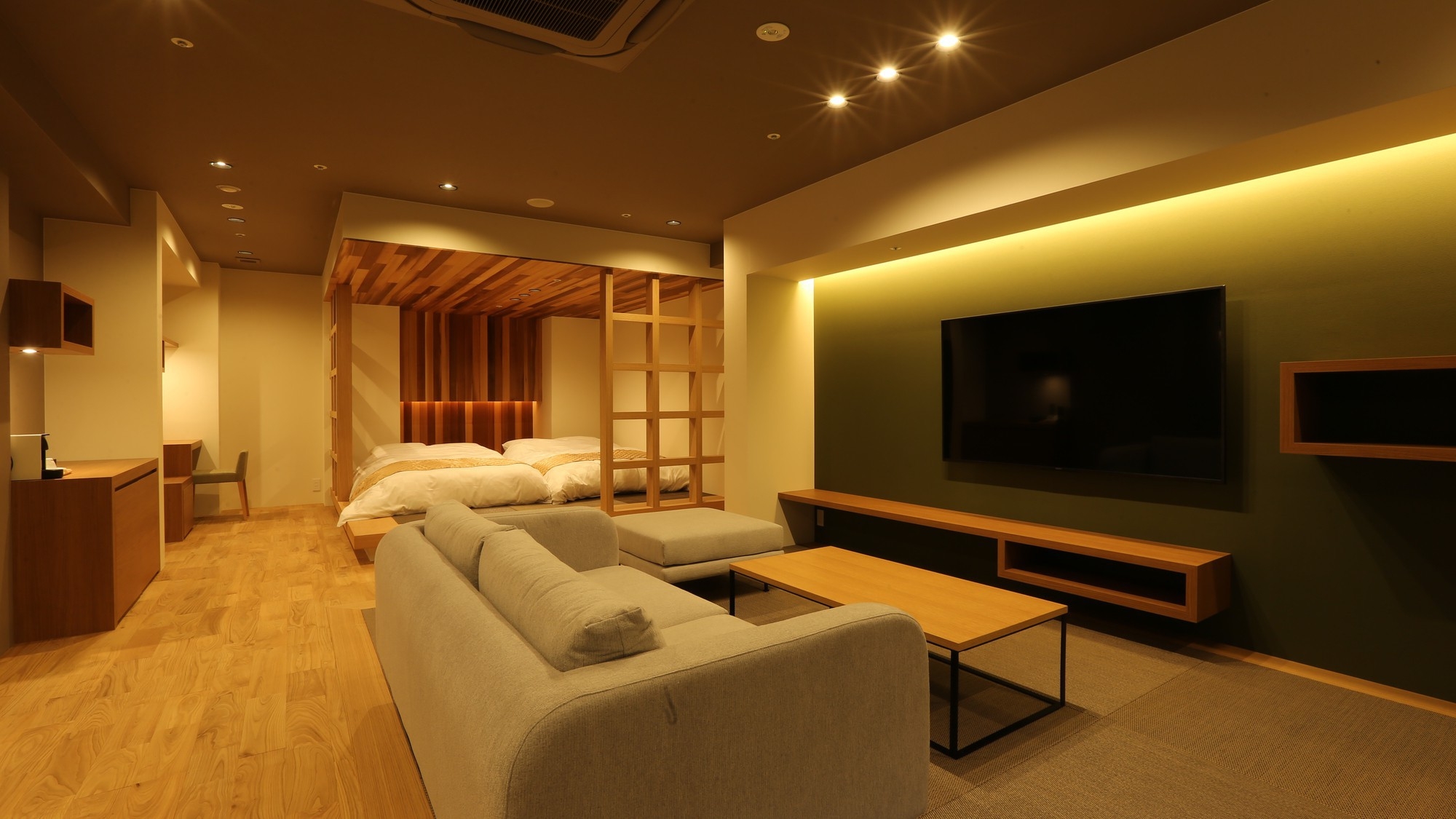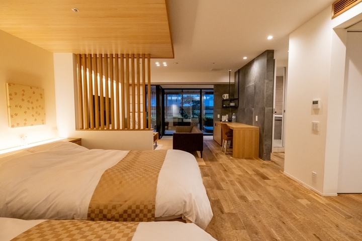客室に温泉露天風呂のついた山側のスイートルームです。ツインまたはキングベッドのご希望はリクエスト制となります。