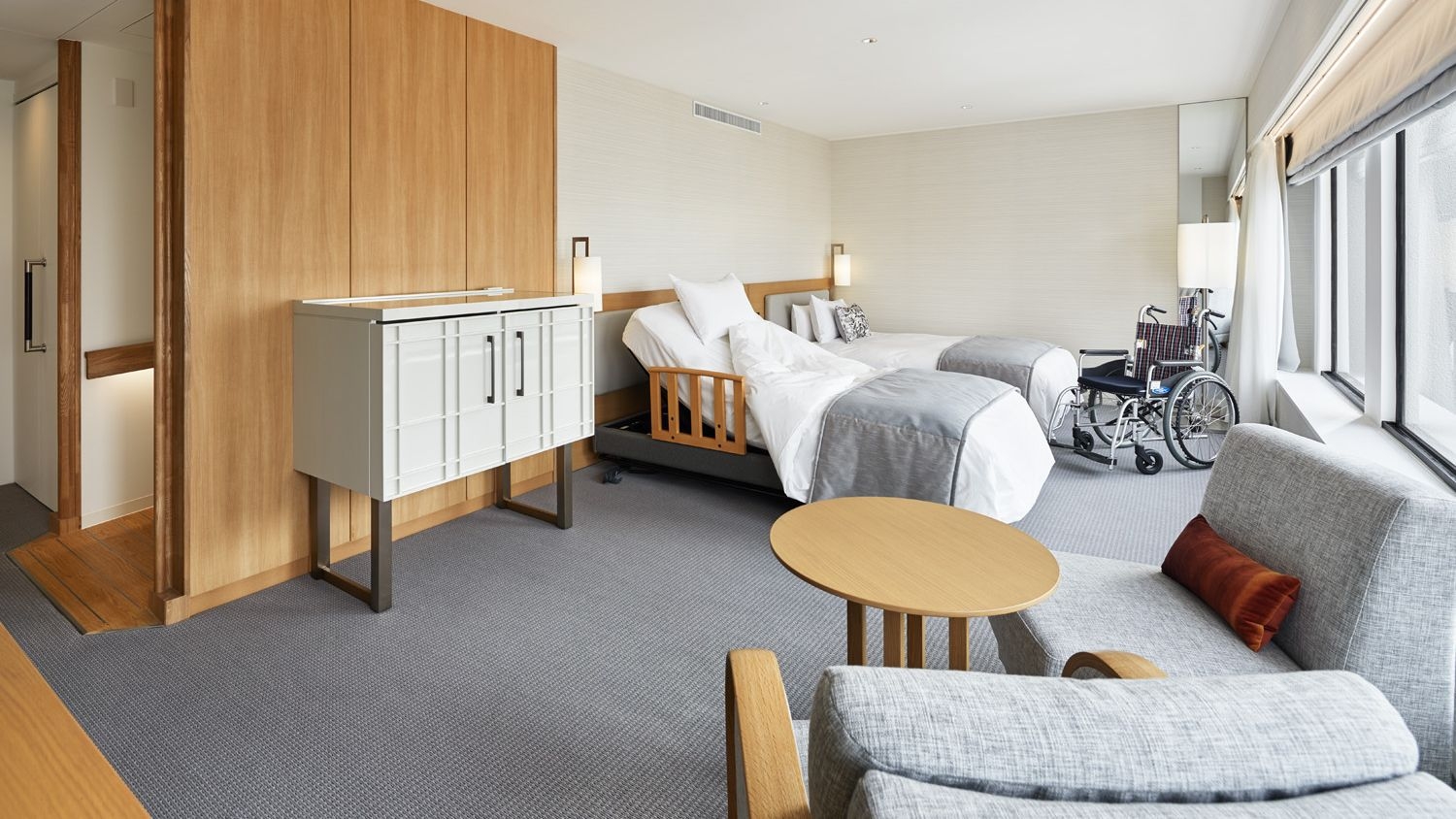 ユニバーサルデザイン仕様のお部屋でございます。お客様の状態ににあわせて取り付けのできる備品をご用意しております。詳しくはお問い合わせください。