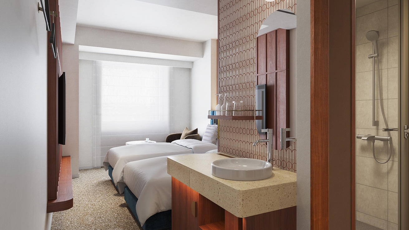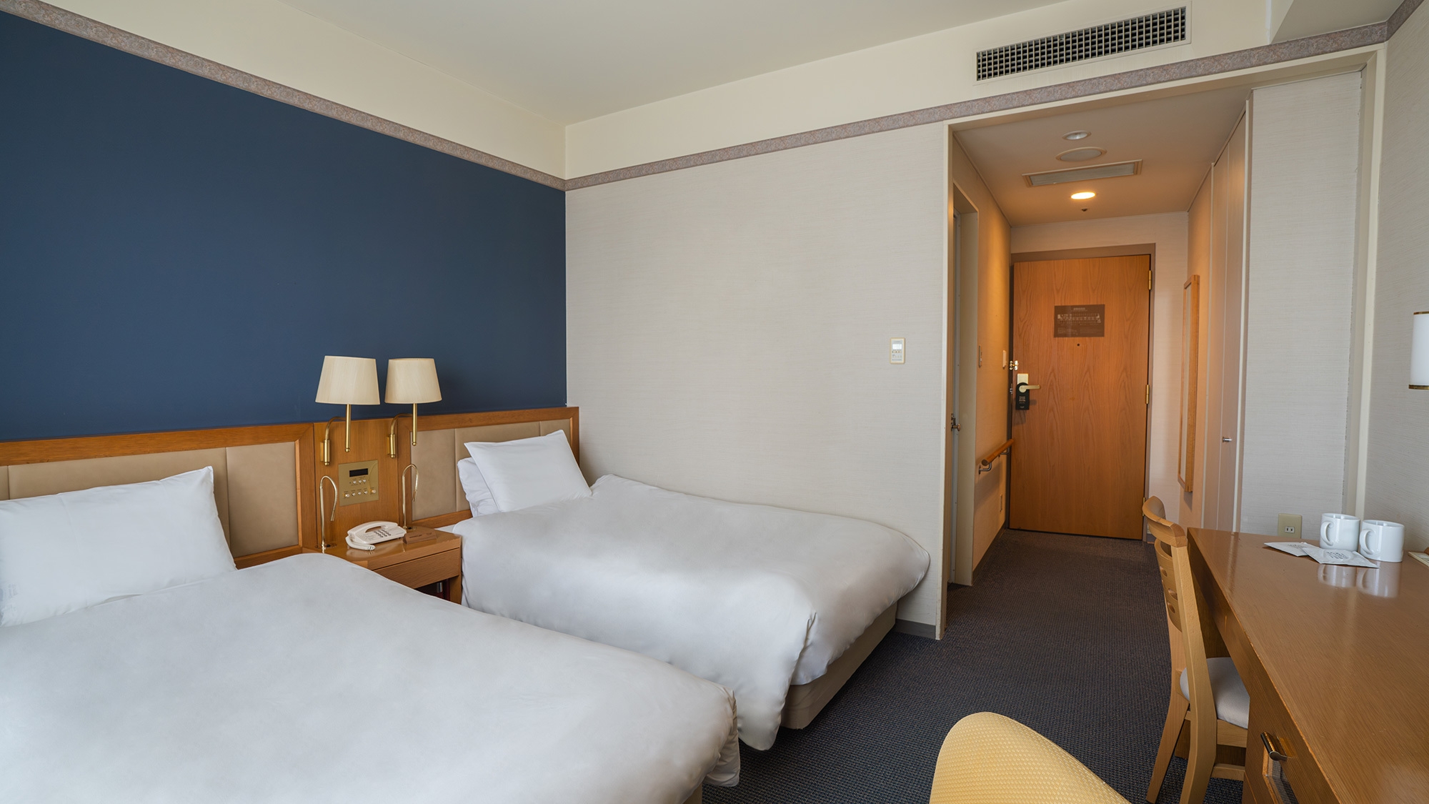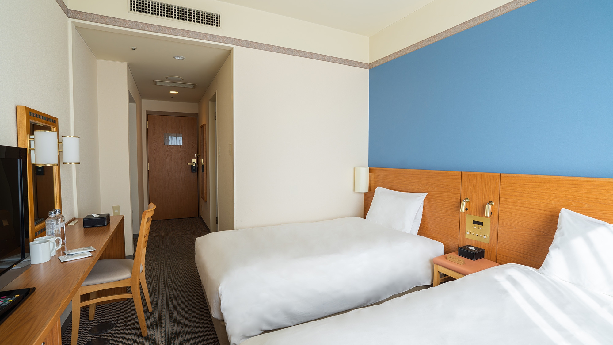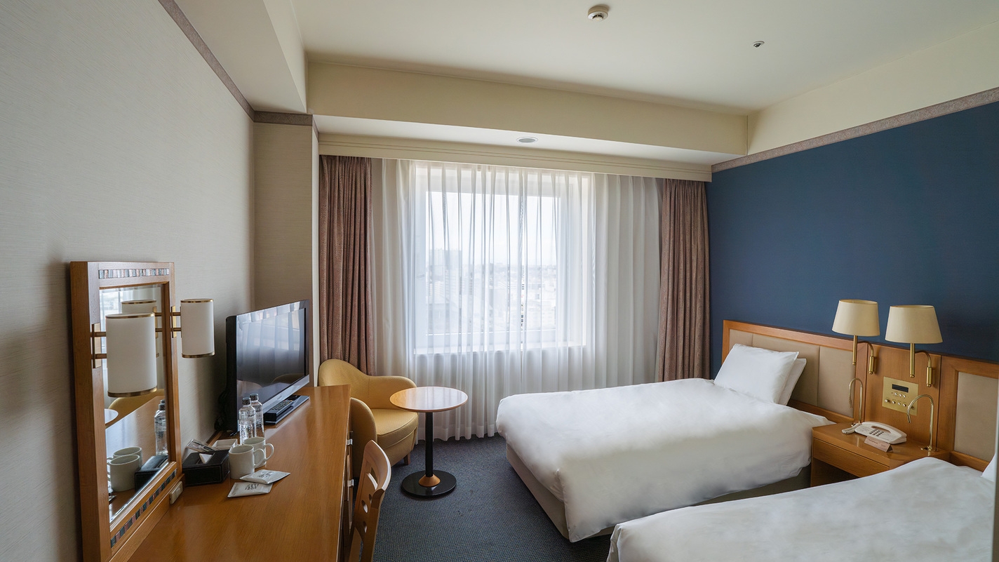 【チェックイン15:00チェックアウト12:00※プランの時間優先】 43平米のもっとも広いツインルーム。窓からは線路沿いの電車も存分にお楽しみいただけます。